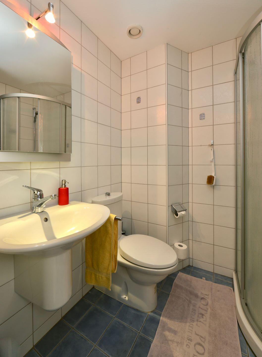 Bad mit Dusche, Waschbecken, Haartrockner und WC.