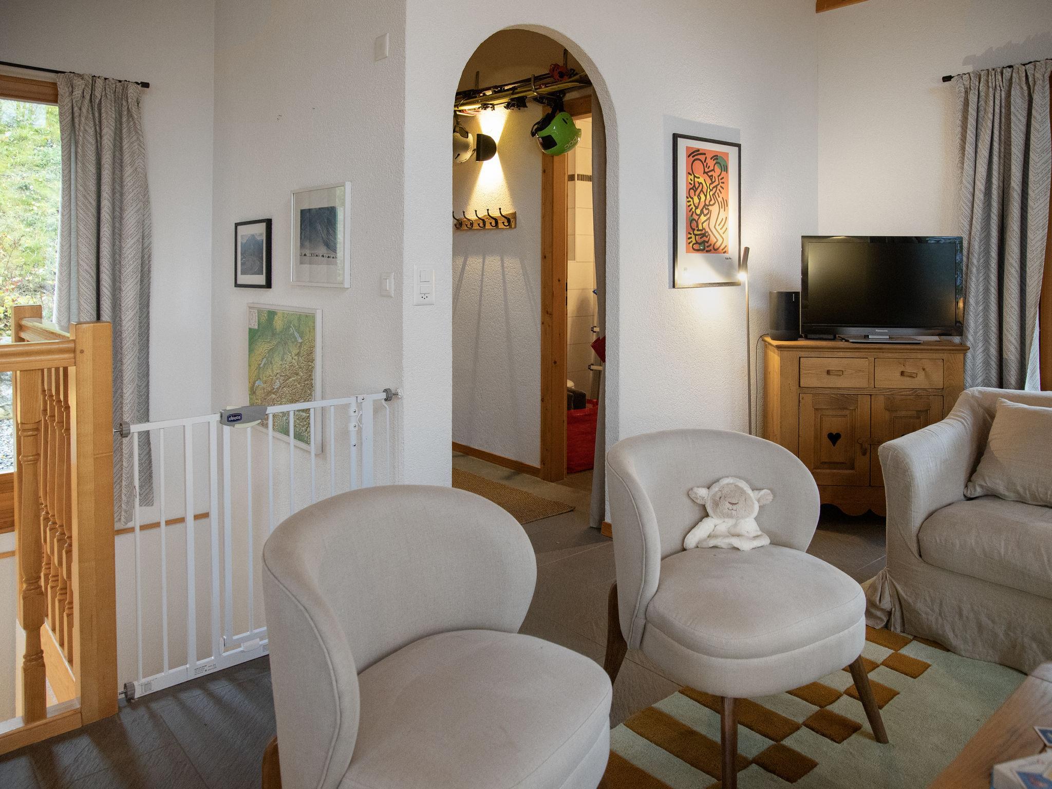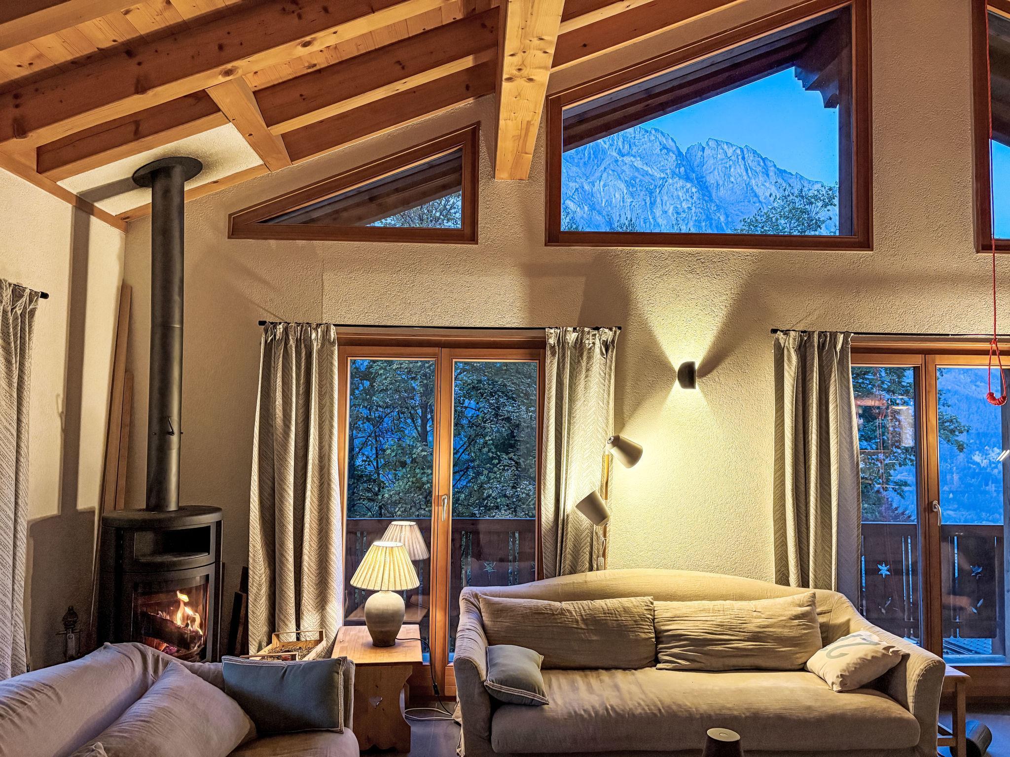 "Helene", 4-room chalet 156 m2 on 2 levels, east facing position. Spacious, comfortable and beautiful furnishings: large living/dining room with panoramic window with Scandinavian wood stove, dining table, hi-fi system and DVD. Exit to the balcony, to the terrace. Open kitchen (oven, dishwasher, 4 ceramic glass hob hotplates, microwave, electric coffee machine, Capsules for coffee machine (Nespresso) extra, raclette grill, fondue Set (chinoise, cheese)). Sep. WC. On the lower ground floor: 1 room with 2 beds (90 cm, length 200 cm). Exit to the garden, to the terrace. 1 room with 1 french bed (160 cm, length 200 cm), shower/WC. Exit to the garden, to the terrace. 1 room with 1 french bed (160 cm, length 200 cm). Bath/WC. Barbecue, deck chairs (6). Very beautiful view of the mountains. Facilities: washing machine, dryer, baby cot for up to 3 year olds. Internet (WiFi, free). Parking (2 cars). E-charging station. Please note: non-smokers only. Parking monitored by CCTV.