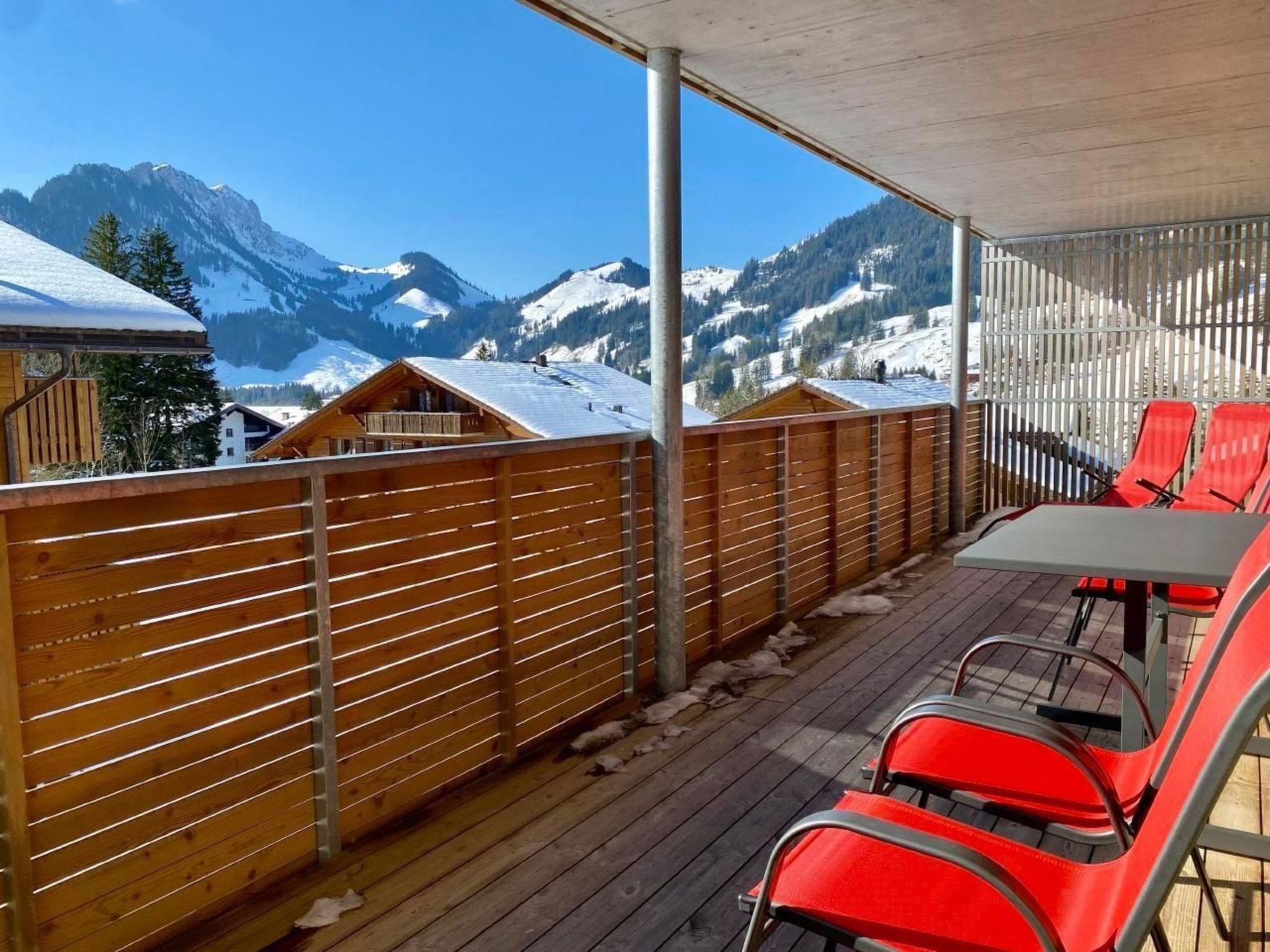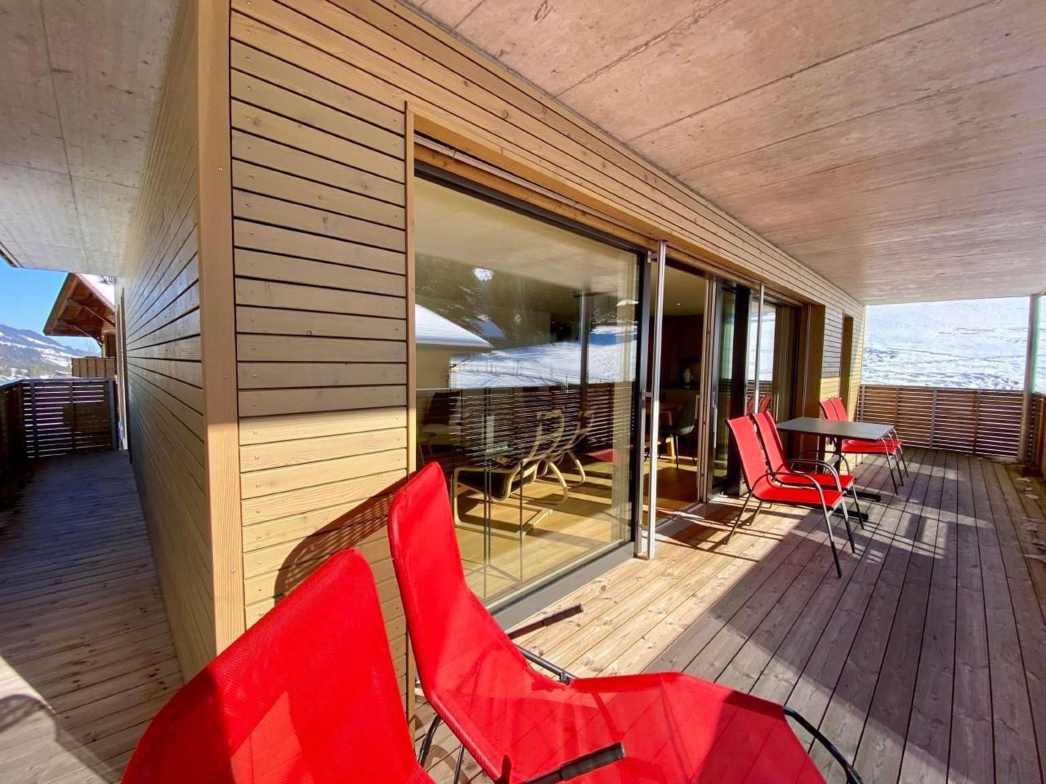 The large balcony with mountain view offers deckchairs, chairs and a table.