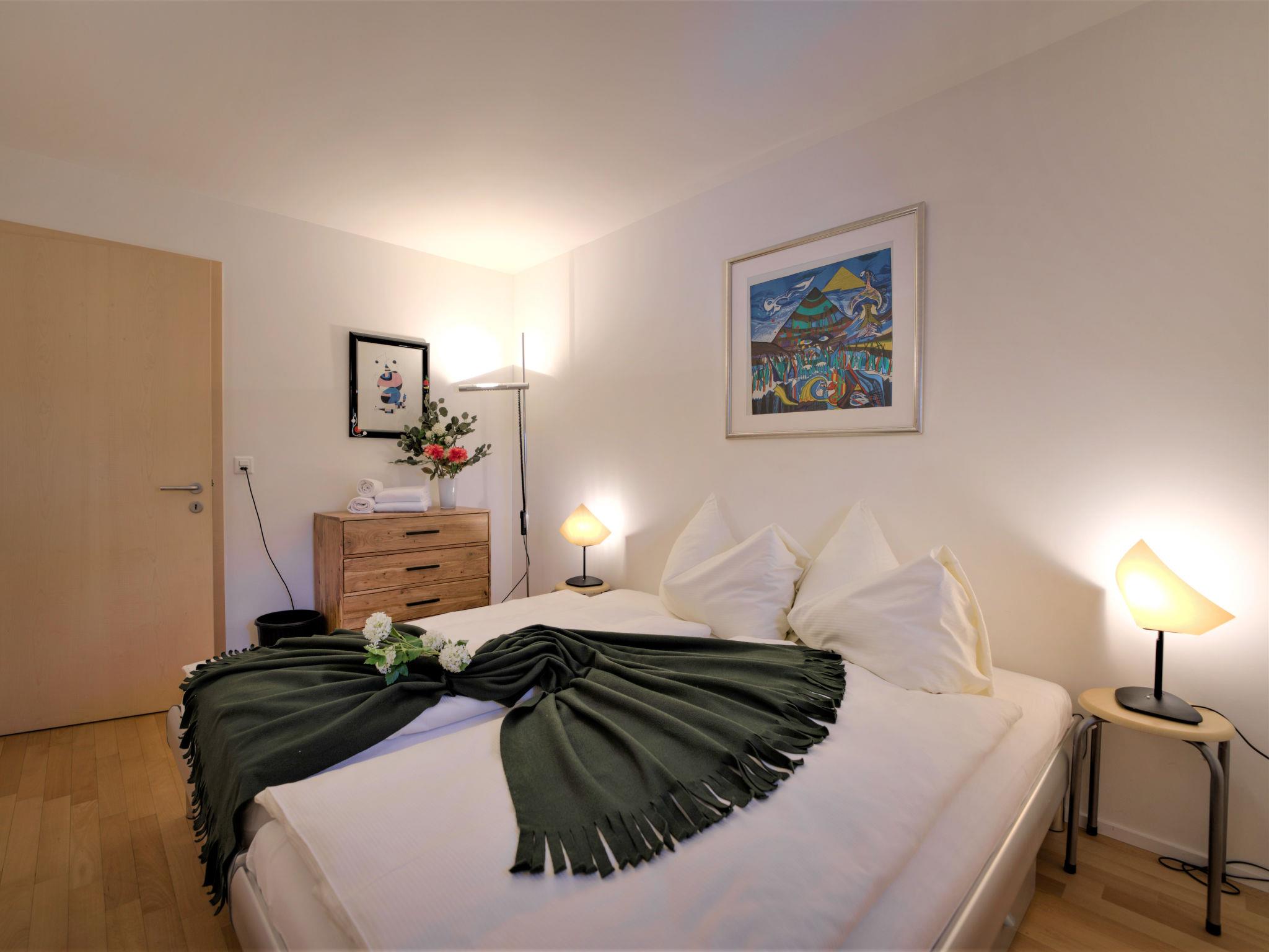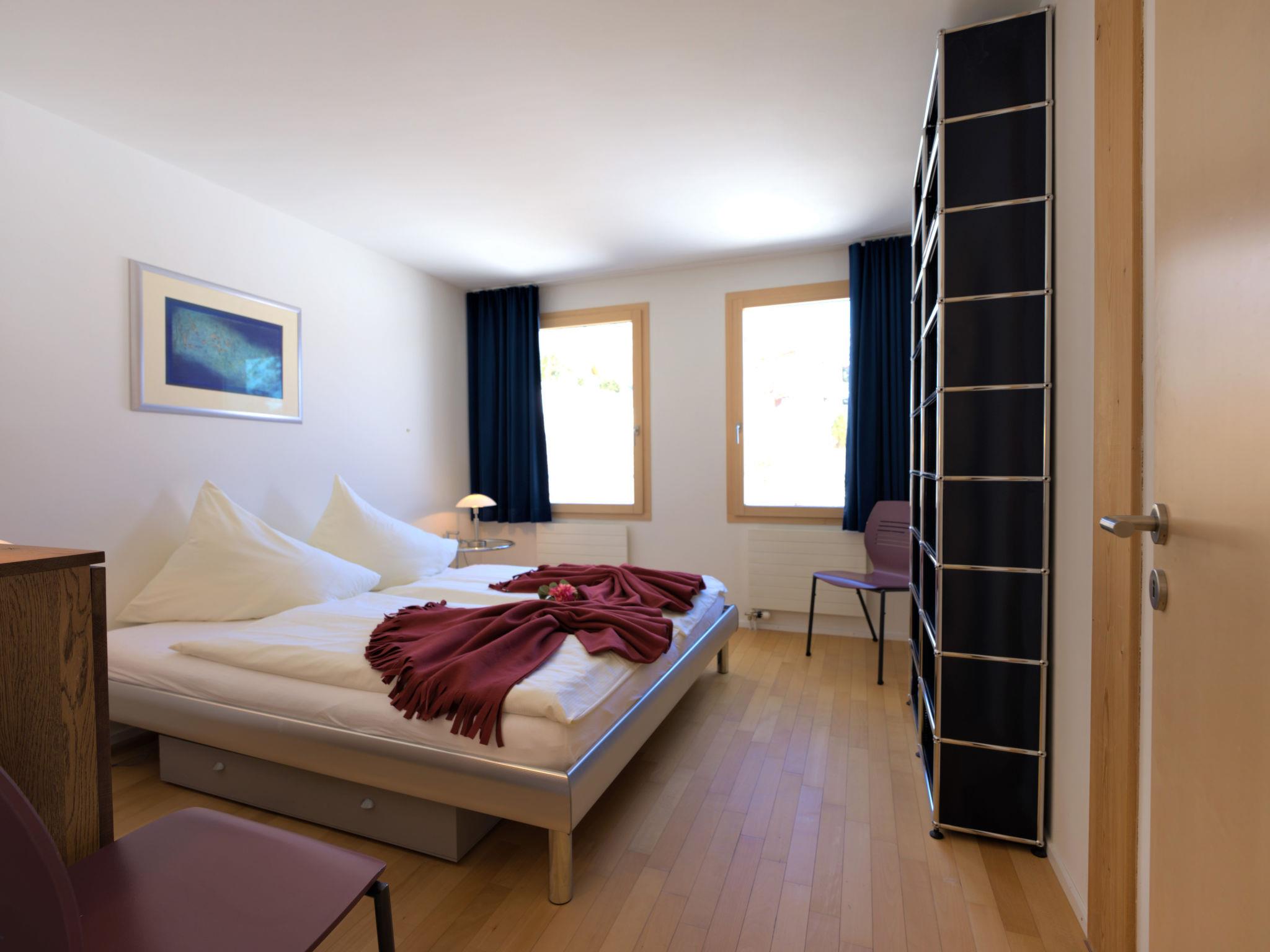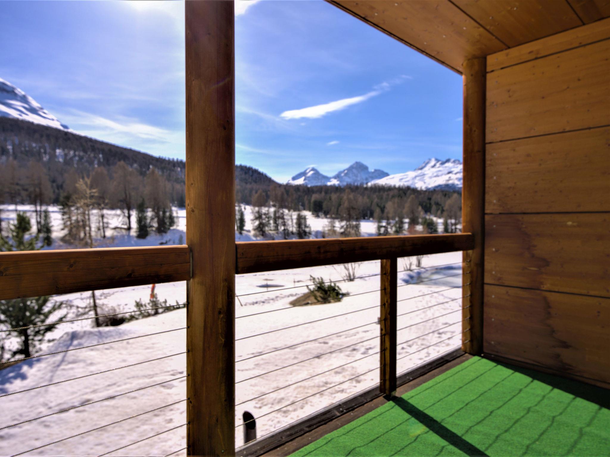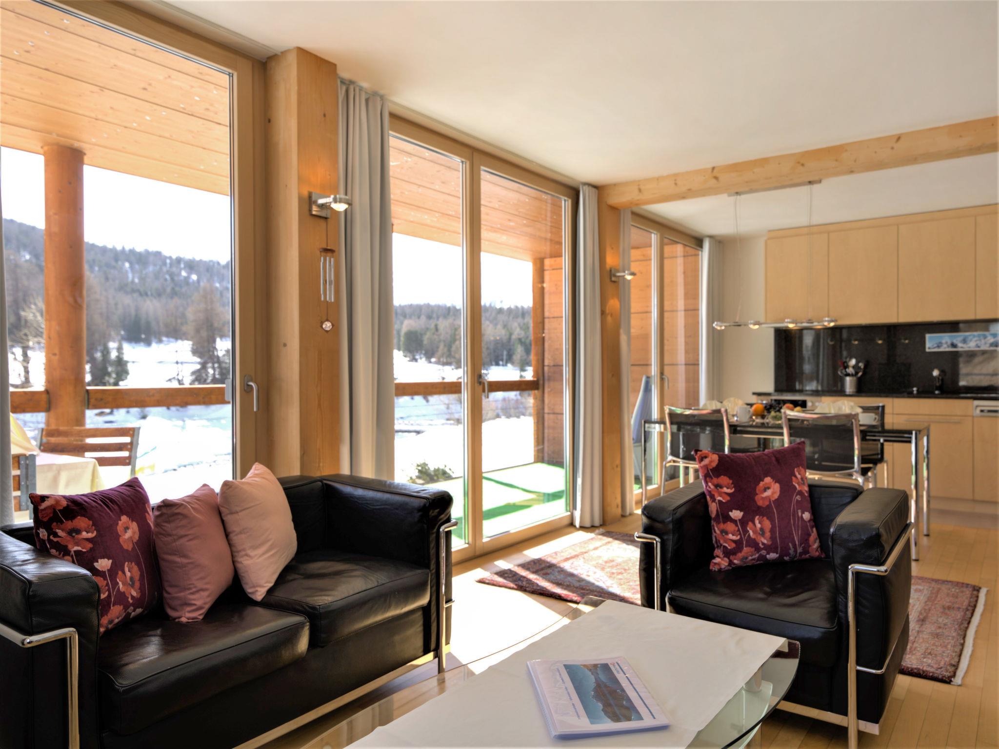 "Chesa Lej", 3-room apartment 88 m2. Bright, comfortable and modern furnishings: open living/dining room with Scandinavian wood stove, TV, radio and DVD. Exit to the balcony, south facing position. 1 room with 1 double bed (2 x 90 cm, length 200 cm). 1 room with 2 beds (90 cm, length 200 cm). Kitchen-/living room (oven, dishwasher, 4 ceramic glass hob hotplates, toaster, kettle, electric coffee machine, raclette grill, fondue Set (chinoise, cheese)). Bath/WC, shower/WC. Floor heating. Wooden floors. Balcony 14 m2. Balcony furniture. Very beautiful view of the mountains and the countryside. Facilities: washing machine, dryer, iron, hair dryer. Internet (WiFi, free). Parking space n M2 (roofed), height 210 cm, width 215 cm. Please note: not suitable for children under 12 years. Non-smokers only, non-smoking house. No lift. :E-Piano, little cabinet space, twin bed room has only one small window.