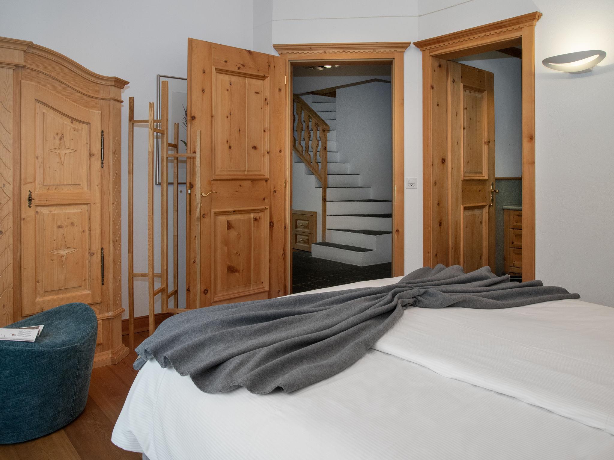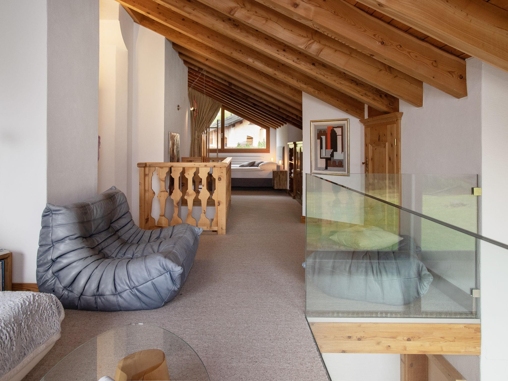 "Chesa Vadret 12", 3-room apartment 110 m2 on 2 levels, on the top floor. Spacious and bright, partly with sloping ceilings, comfortable and modern furnishings: open living/dining room. Exit west facing position. 1 room with 1 french bed (1 x 160 cm, length 200 cm), bath/bidet/WC. Kitchen (oven, dishwasher, 4 ceramic glass hob hotplates, toaster, kettle, electric coffee machine, Capsules for coffee machine (Nespresso) extra, fondue Set (cheese)). Shower/WC. Heating. Upper floor: open large gallery with 1 french bed (2 x 80 cm, length 200 cm). Open walk-through room with TV. Large balcony 10 m2. Balcony furniture. Marvellous panoramic view of the mountains and the valley. Facilities: iron, hair dryer. Internet (WiFi, free). Garage space n Vadret 12, height 225 cm, width 250 cm. Please note: not suitable for children under 6 years. Non-smokers only. Instead of an enclosed bedroom, some sleeping areas are located in an open-plan area (gallery, alcove, etc.).