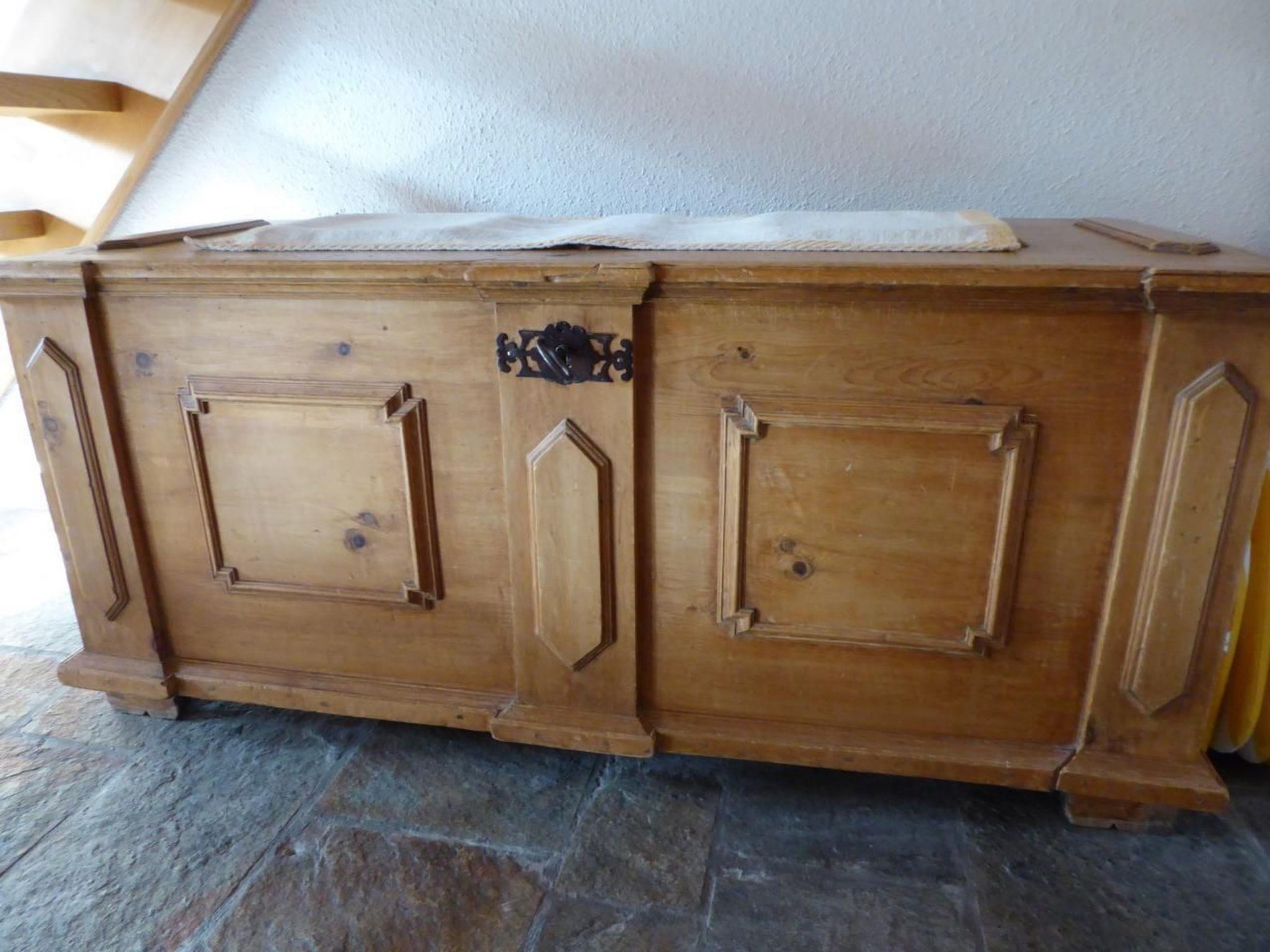 Above the living area is a spacious gallery with two windows. There is a double bed with bedside table. A wardrobe, chest of drawers and wall cupboard provide ample space for storing equipment and clothes. Two workstations with views of the forest or the village are ideal for writing or reading. On the lower floor (entrance level) there are two bedrooms: a double room with a large wardrobe and a room with two separate beds, a wardrobe, table and chairs (wood panelling). Next to it is a spacious bathroom with bath, shower, WC and washing machine. Tables, chairs and two deckchairs are available on the terrace and the cosy spot at the rear exit. You can store your skis in your own garage (with parking space).
