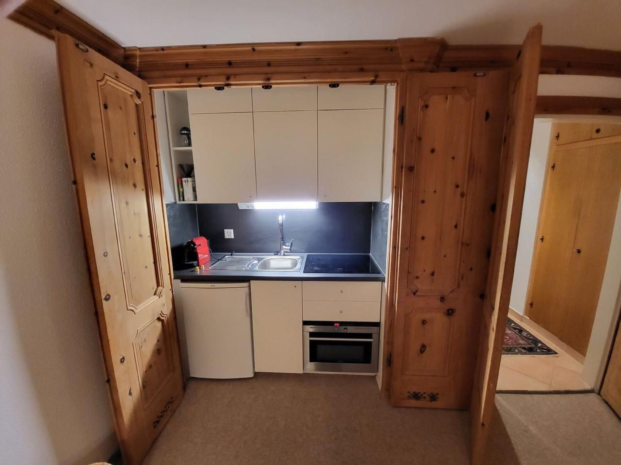 Individual, neat studio (28m2)with living-bedroom with high quality, handmade Swiss stone pine furnishings in Graubünden style with balcony, small hallway. The pine wood panelling elegantly hides the kitchen and beds. To the right and left of the fold-out beds is a built-in wardrobe, in the middle integrated 2 beds (90x200) to fold down at night. The kitchenette with oven, 4-plate induction stove, refrigerator and coffee maker is located on the other side behind collapsible pine wood paneling, matching the overall style of the room. Additional cozy sitting area with corner bench, arven table and two chairs. Elaborately designed new bathroom: bathtub with glass partition for showering, toilet, large washbasin, mirrored cabinet, spot lighting. The apartment can be rented together with the adjacent 3-room apartment if necessary.Washing machine and ski roombefinden in the basement,a garage is rented with the apartment, 50m to the bus stop. Here stop all the buses that serve the entire Engadine and go to the ski slopes and mountain railroads.