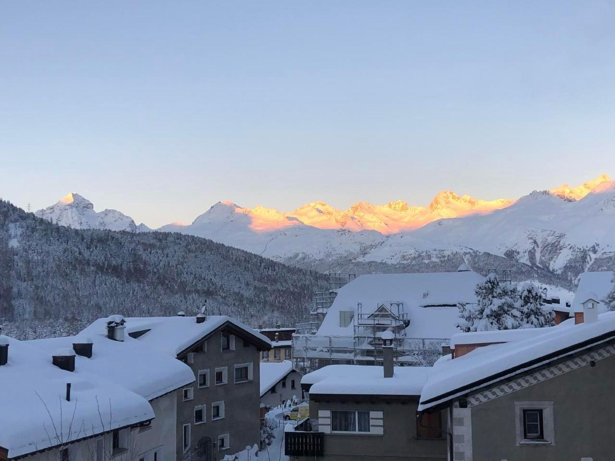 Discover this charming, spacious studio (44 square metres) in Pontresina, which impresses with its large windows, inviting ambience and well thought-out furnishings. The quiet location not only guarantees pure relaxation, but also a breathtaking view to the south/south-west over the rooftops to the peaks of Piz Rosatsch, Piz Julier and Corviglia. You can also experience spectacular sunsets here.