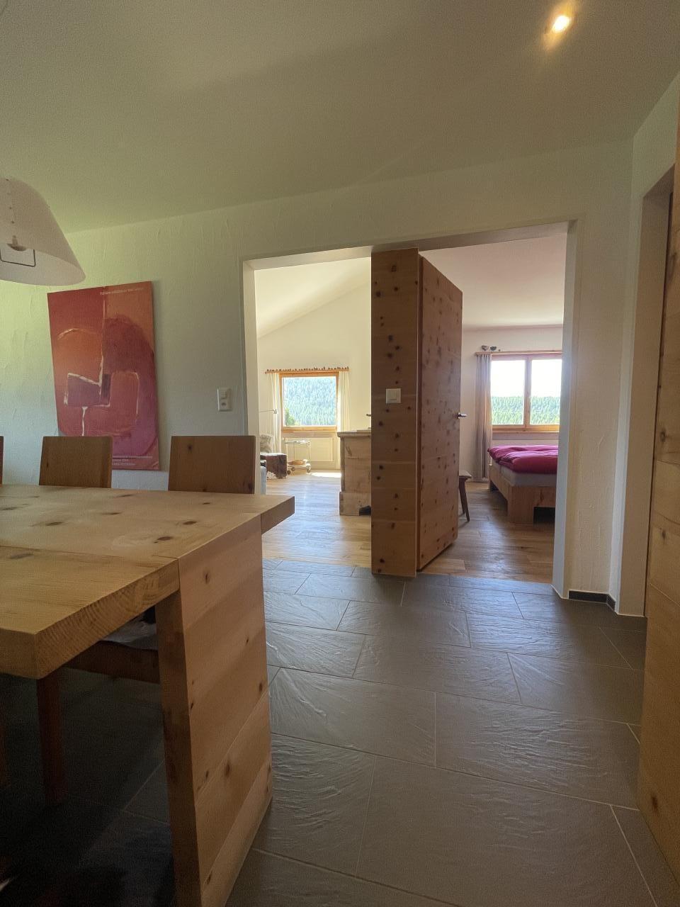 Welcome to your dream holiday in the Engadine! Experience unforgettable days in our spacious and sunny 3.5-room flat with an area of 80 m², located on the second floor in a perfect south-facing position. From the balcony as well as from all rooms you can enjoy a marvellous view. The flat promises a real feel-good ambience, not only because of its location, but also because of its high-quality finish in beautiful Swiss stone pine and real wood parquet flooring in the living room and bedrooms.