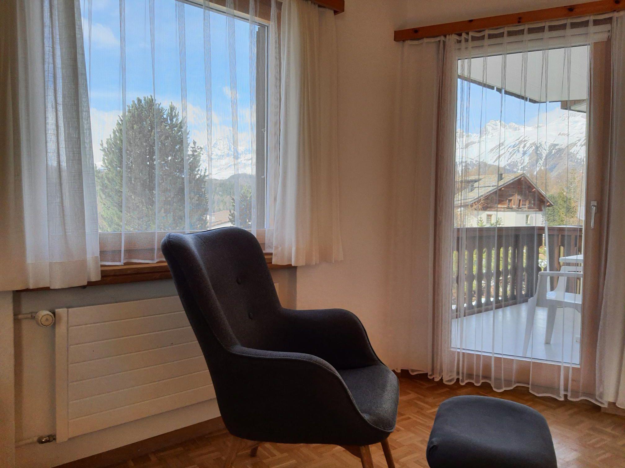 Bright, spacious living room with dining table and sitting area, with Swisscom TV and WLAN. Sunny, spacious, furnished south-facing balcony with uninterrupted views of the Engadine mountains. Separate kitchen with dishwasher, large fridge, oven, fondue set, raclette oven, kettle, Nespresso coffee machine etc. Bathroom with new remodelled shower with WC and separate WC. 1 double bedroom with wardrobe and plenty of storage space. Washing machine, ski room, bicycle room in the house for general use. Garage space in underground car park. Close to bus stop, cross-country ski run and hiking trails. Pets not allowed. Non-smoking flat.