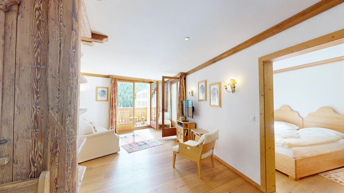 Die Wohnung ist mit viel Holz im Chalet-Stil ausgestattet und mit ausgewählten Materialien und Möbeln eingerichtet.