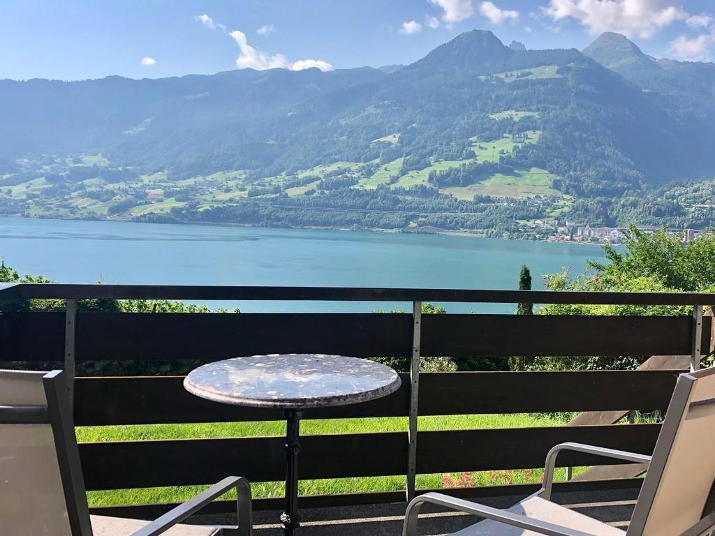 Bright, beautifully furnished living and dining room with Swedish stove and full view of Lake Walen. Large terrace with dining table. Well-equipped kitchen. One large bedroom, one large bedroom and playroom and large bathroom/WC on the upper floor. Two rooms (11m2 each) and shower/WC in the basement. Outdoor sauna on the lower terrace. The WLAN is also suitable for home office.