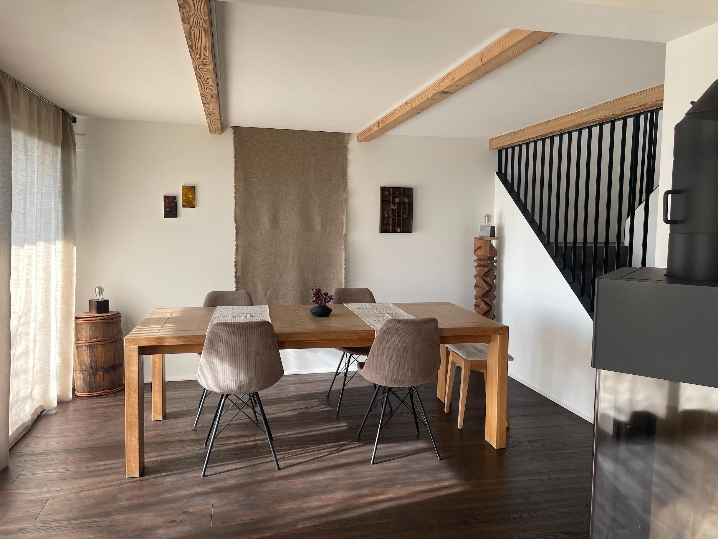 Whether the weather is fine or rainy, the flat offers everything you need to make your home cosy: The lighting concept ensures a cosy ambience at all times and the fireplace stove warms you even on cooler days. The fully equipped kitchen invites you to cook and the private, spacious terrace offers you an additional dining table with midday and evening sun. Enjoy the marvellous view from the private balcony of the lovely hilly landscape with forests, where deer and foxes are out and about every day. For your sports training, the flat offers you a fitness corner, Wi-Fi and printer allow you to work comfortably from home and for entertainment and inspiration you will find selected literature, games and local works of art (no TV available). I personally designed the interior architecture with great attention to detail: It was important to me to make the old building structure visible, so that the traditional charm is preserved even with modern comfort.
