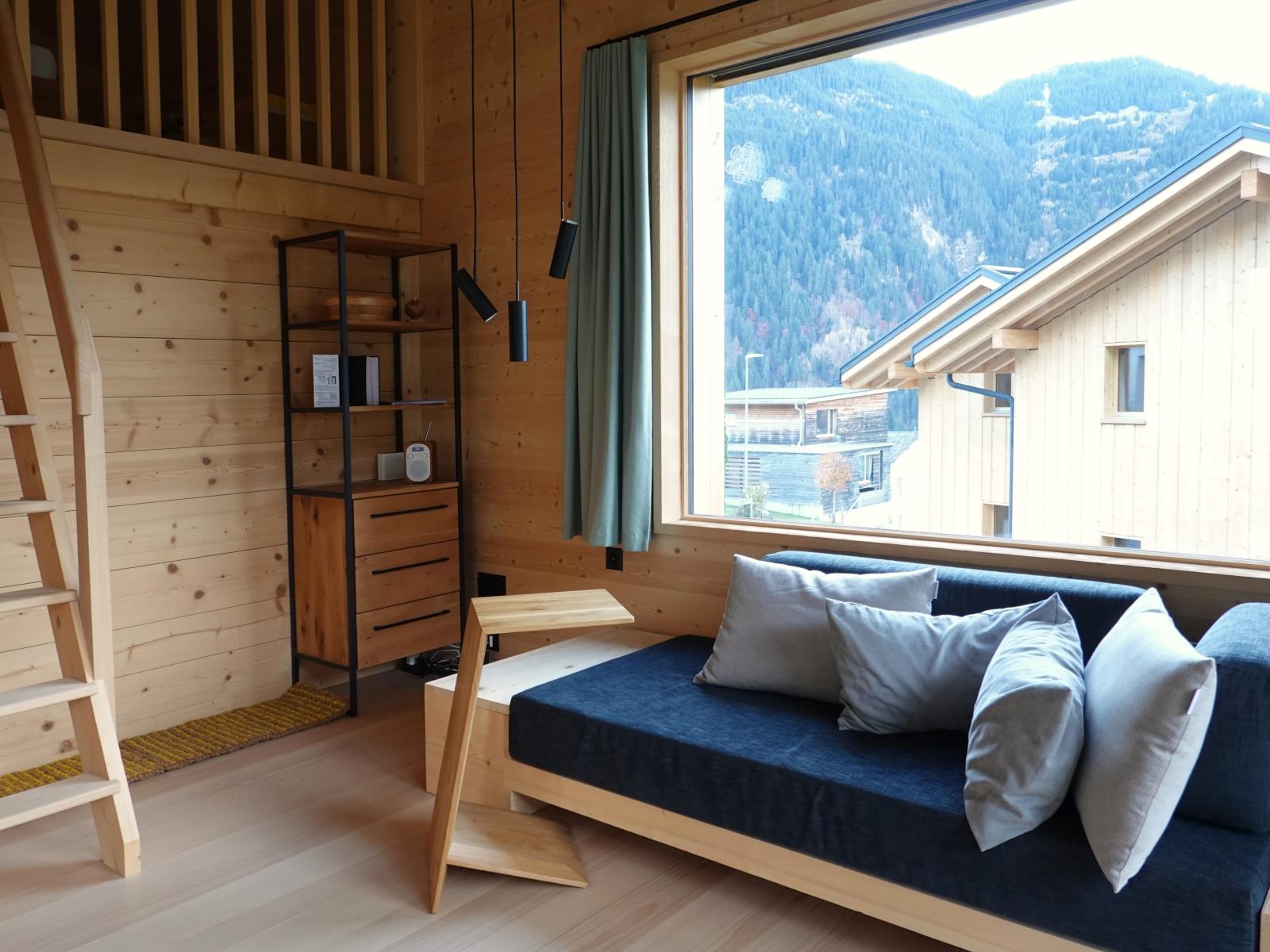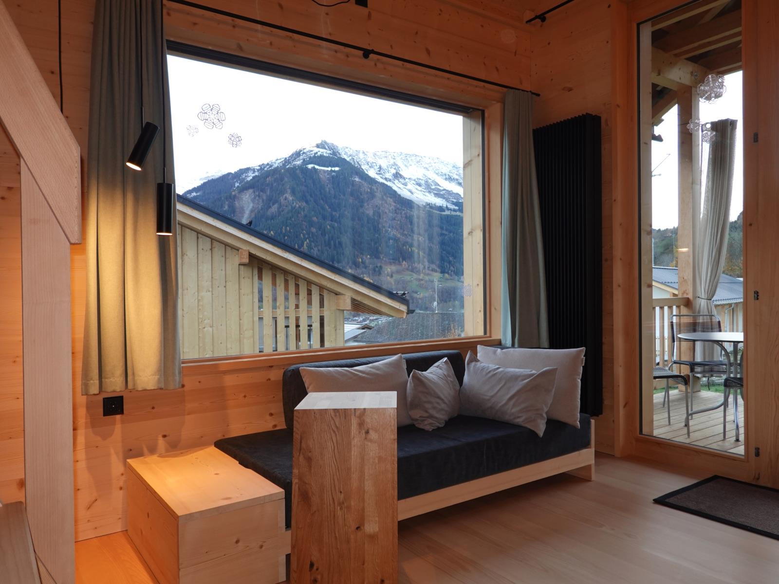 Der offen gestaltete, gemütliche Wohnraum integriert Küche und Galerie. Vom Sofa oder Tisch aus blicken sie durch grosse Fenster auf die herrliche Bergwelt. Sie gelangen direkt auf den gedeckten Balkon und geniessen dort den Sonnenauf- und -untergang. Zur Ausstattung gehören WLAN, ein DAB-Radio, diverse Lektüren und Spiele.Küche: