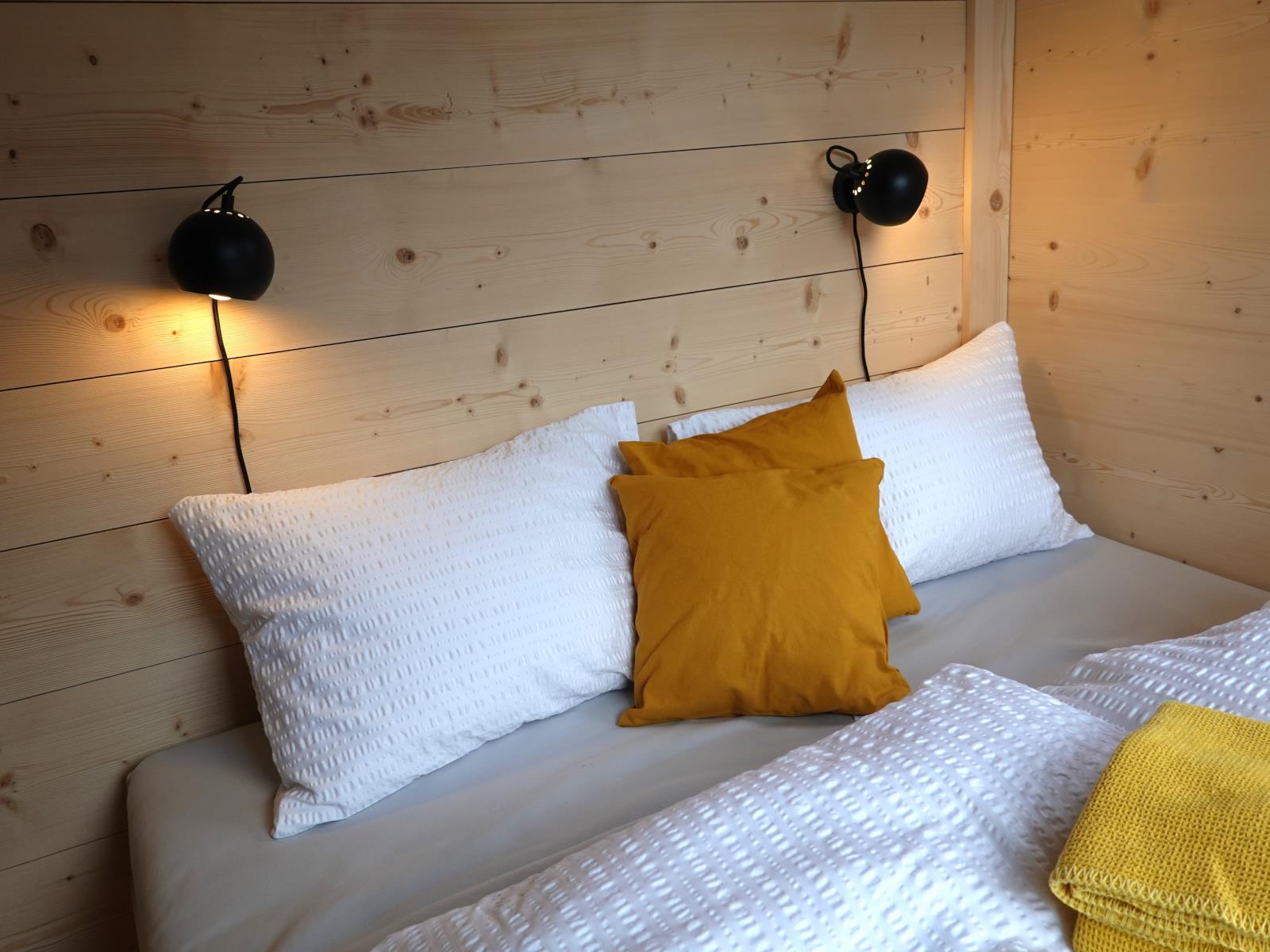 Schlafzimmer im EG: 1 Doppelbett (160 cm x 200 cm). Galerie: 1 Doppelbett (160 cm x 200 cm), erreichbar über eine steile Treppe. Wohnraum: 1 Schlafsofa für 1 Person (85 cm x 190 cm). Alle Betten sind bezogen und die Bettwäsche ist im Preis inbegriffen. Für die Kleinen wird eine Zewi-Decke 90x200 zur Verfügung gestellt.Wohnzimmer: