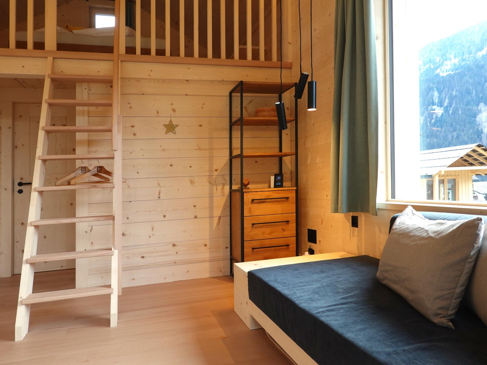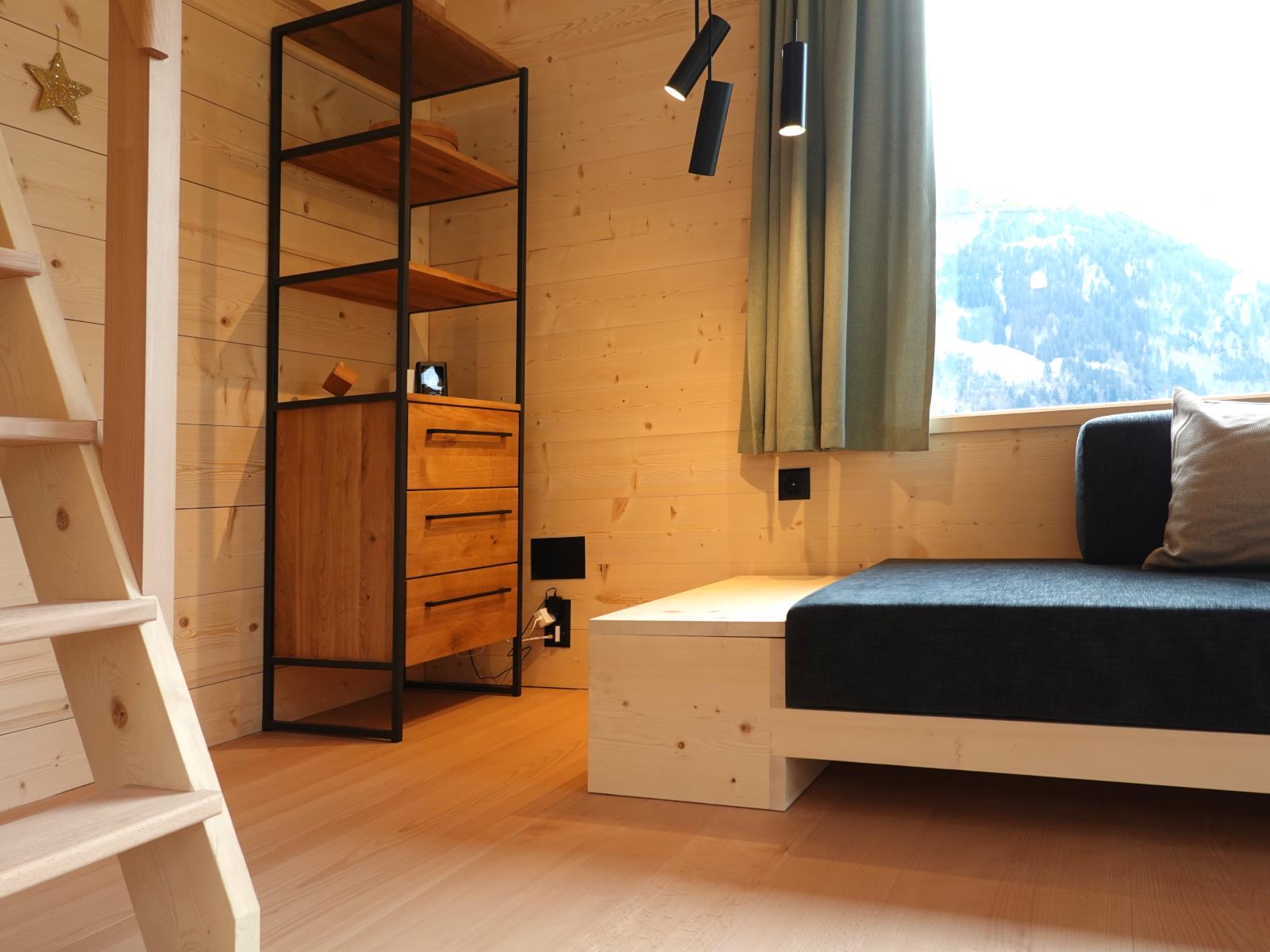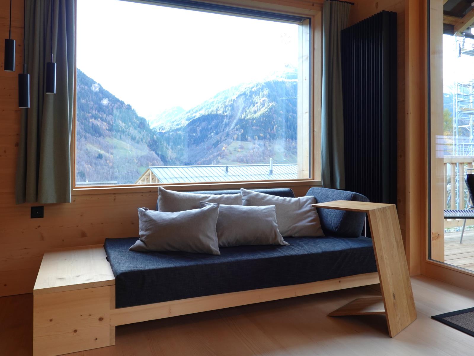 Der offen gestaltete, gemütliche Wohnraum integriert Küche und Galerie. Vom Sofa oder Tisch aus blicken sie durch grosse Fenster auf die herrliche Bergwelt. Sie gelangen direkt auf den gedeckten Balkon und geniessen dort den Sonnenauf- und -untergang. Zur Ausstattung gehören WLAN, ein DAB-Radio (mit Bluetooth), diverse Lektüren und Spiele. Küche: