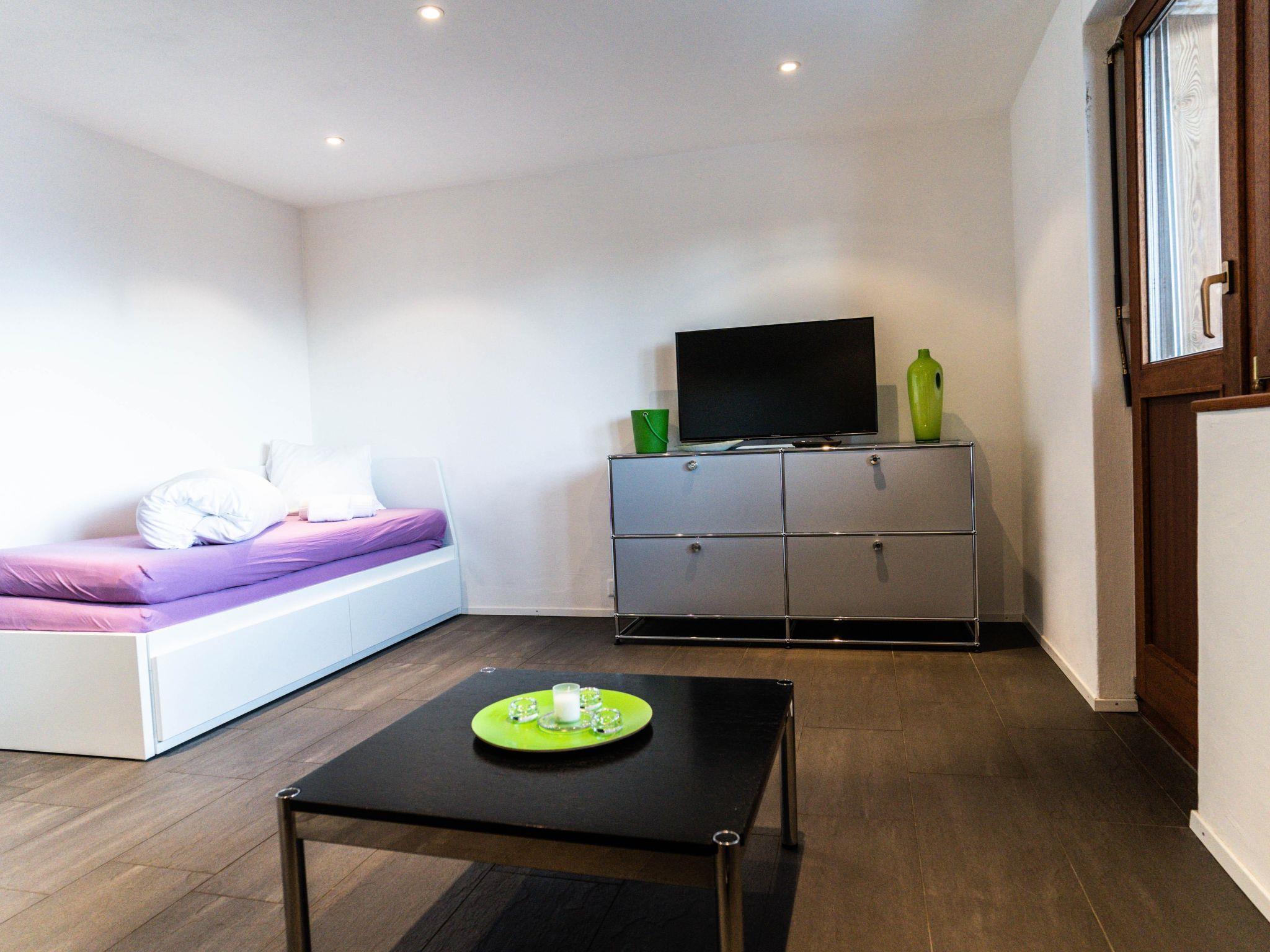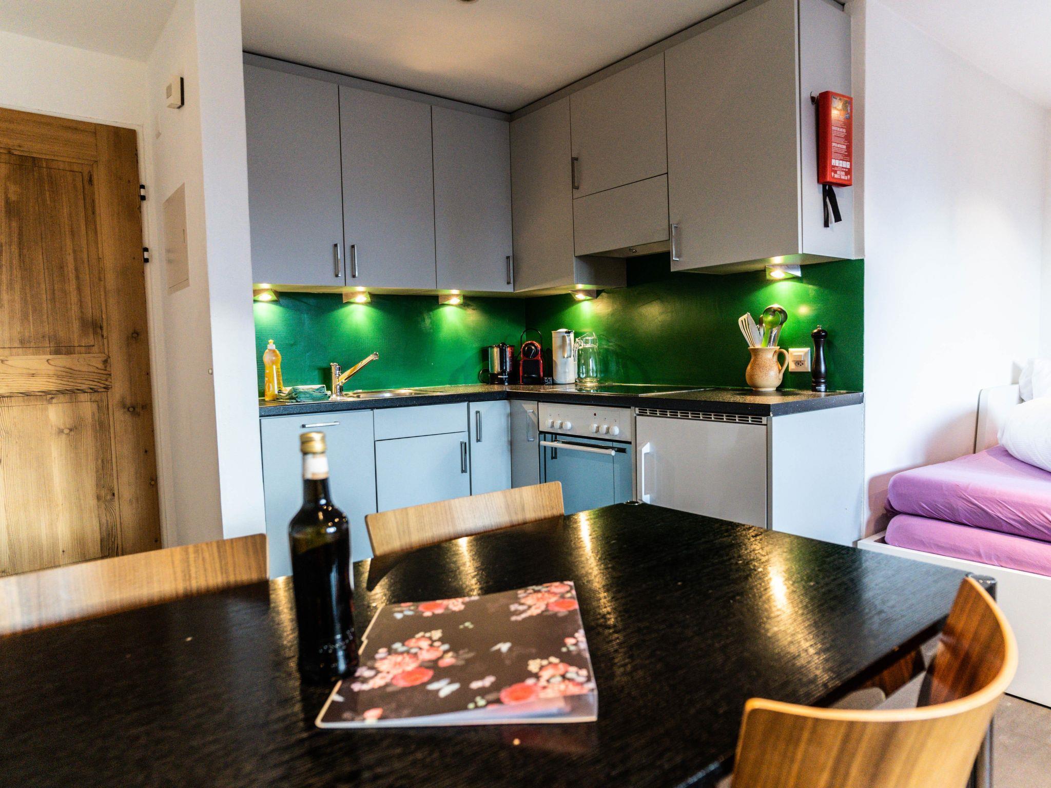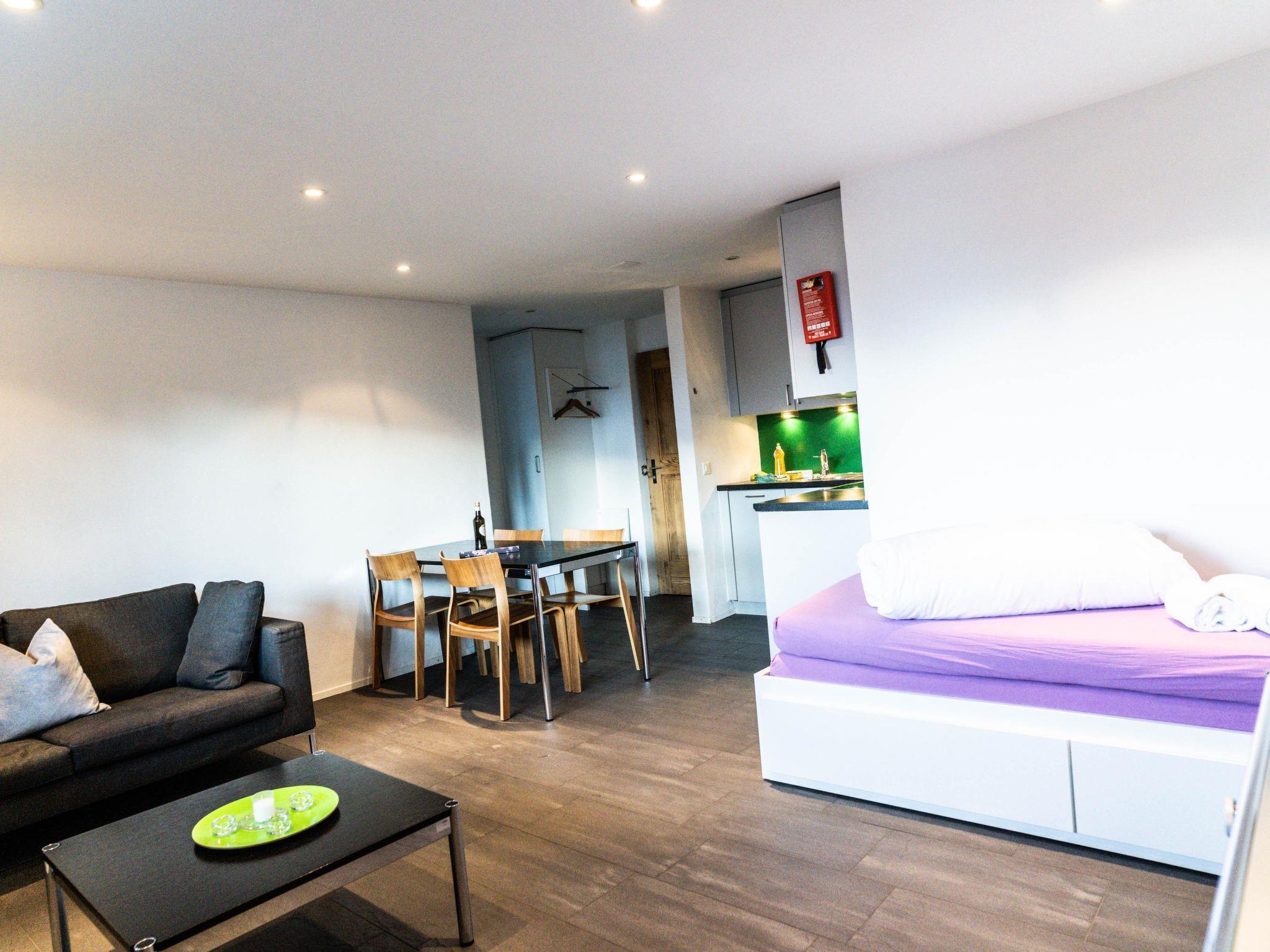 The 2 1/2-room apartment in the Sportina house accommodates up to three people and is cozy and modernly furnished. It features a bedroom with a double bed as well as a comfortable folding bed in the living area for a third person. The open living and dining room is equipped with a modern kitchen that includes a dishwasher and a Nespresso machine, among other amenities. A south-facing balcony with a view of the Valais four-thousanders invites you to linger. The apartment offers free Wi-Fi, satellite TV and access to a laundry room in the basement. A ski storage room with a boot dryer is also available.
