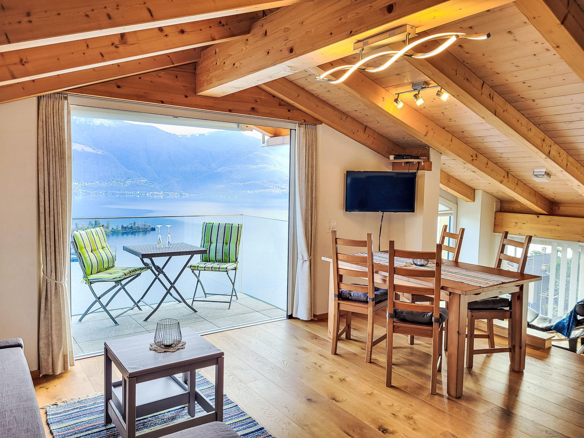 "Ca dal Non", 3-room apartment on 2nd floor. Spacious and bright, fully renovated in 2018, comfortable and modern furnishings: open living/dining room with sloping ceilings with Scandinavian wood stove, dining table and cable TV (flat screen). Exit to the balcony. 1 double bedroom with 1 double bed (160 cm, length 200 cm). Exit to the balcony. 1 room with sloping ceilings with 2 beds (90 cm, length 200 cm). Open kitchen (oven, dishwasher, 4 ceramic glass hob hotplates, freezer, electric coffee machine, Capsules for coffee machine (Nespresso) extra). Shower/WC. Underfloor heating. Small balcony, south facing position. Balcony furniture. Marvellous panoramic view of the lake, the mountains, the countryside, the resort and the Isole di Brissago. Facilities: washing machine, dryer, iron, children's high chair, baby cot for up to 2 year olds (extra), hair dryer. Internet (WiFi, free). Please note: non-smokers only. Maximum 1 small pet/ dog allowed. NL-00011366