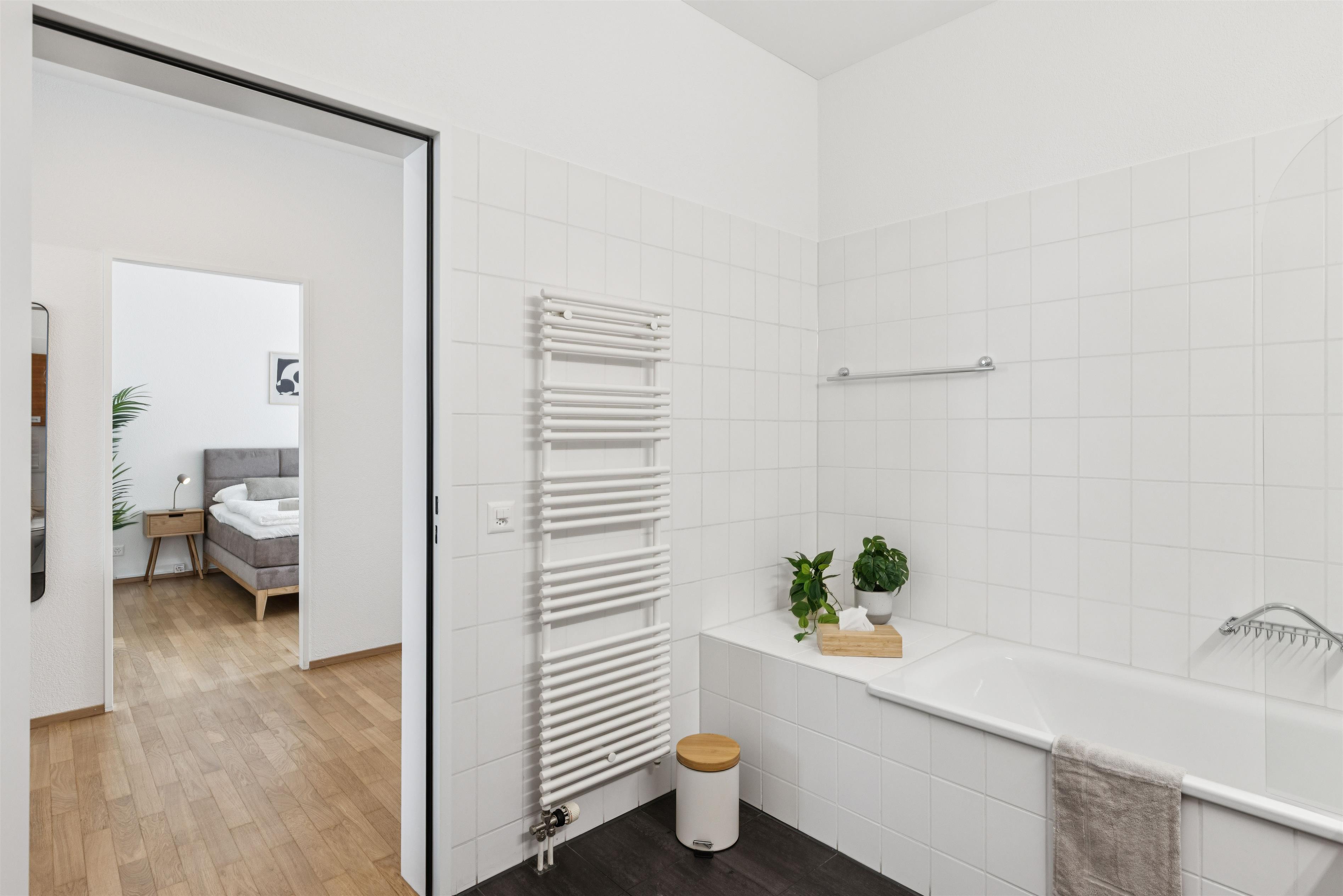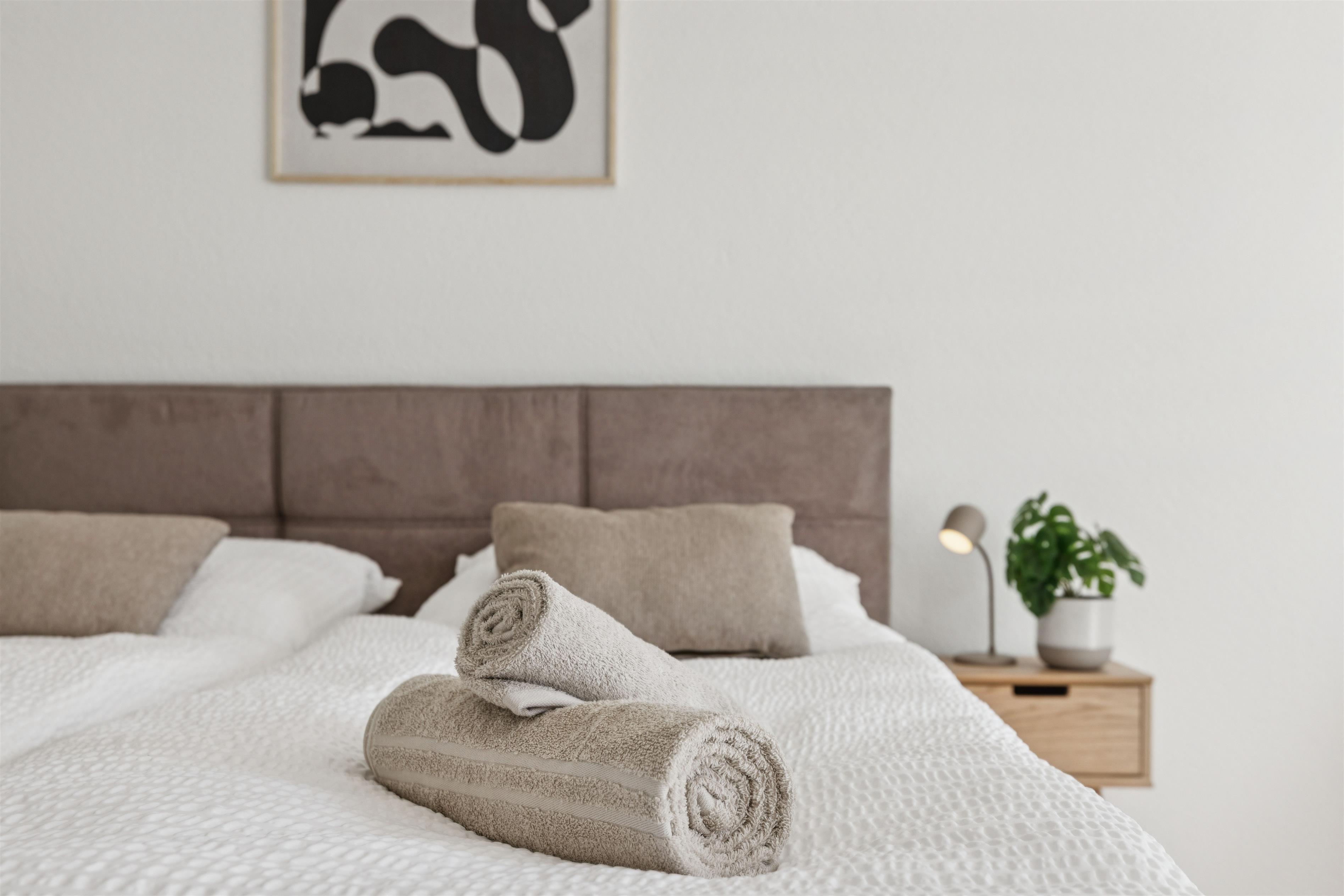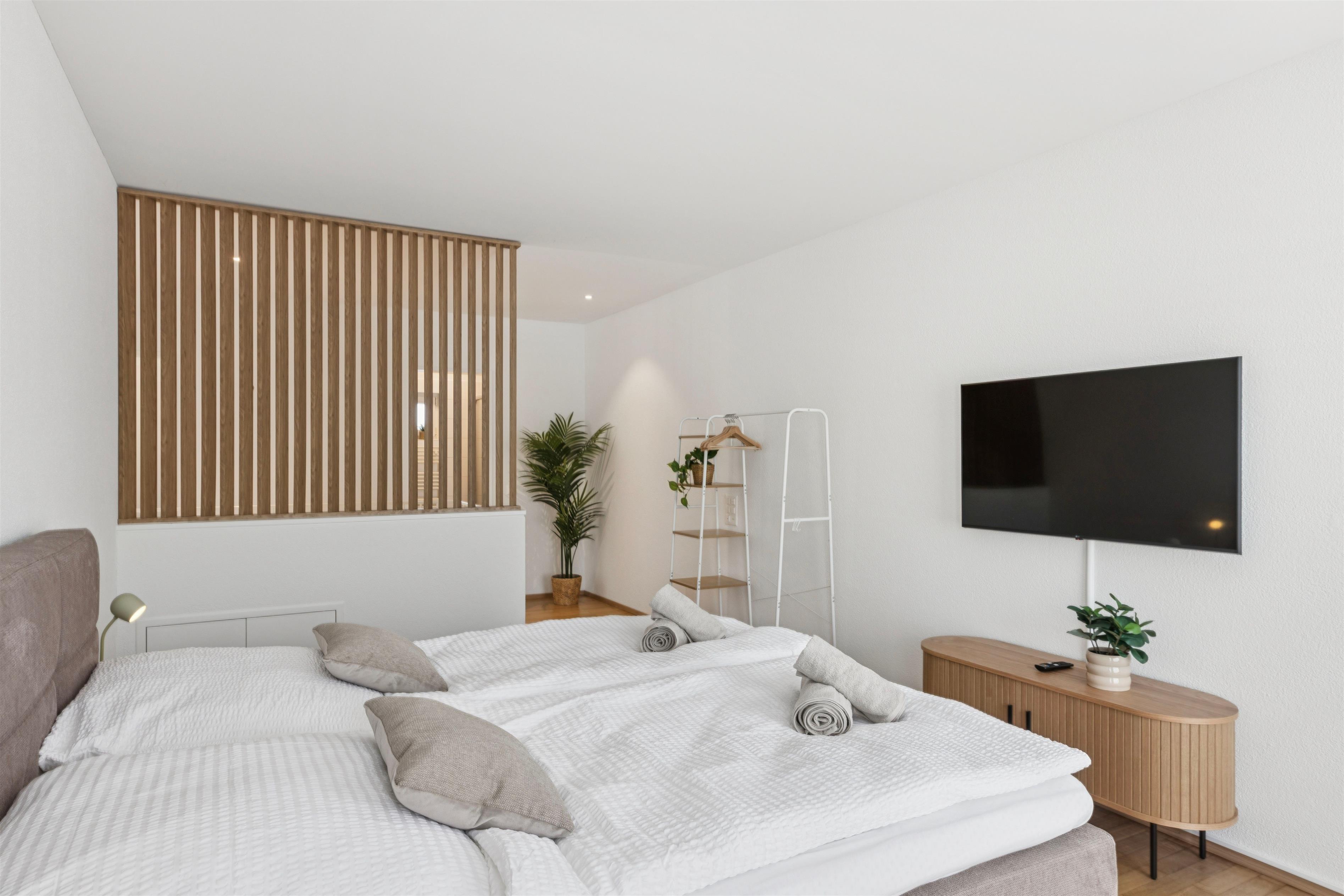 Inside the flat, amenities such as underfloor heating throughout the flat, a smart TV for cosy evenings and a washing machine and tumble dryer for your sole use ensure a carefree stay. The kitchen is fully equipped with a ceramic hob, capsule coffee machine, kettle, toaster, rice cooker, microwave and dishwasher and invites you to cook together.