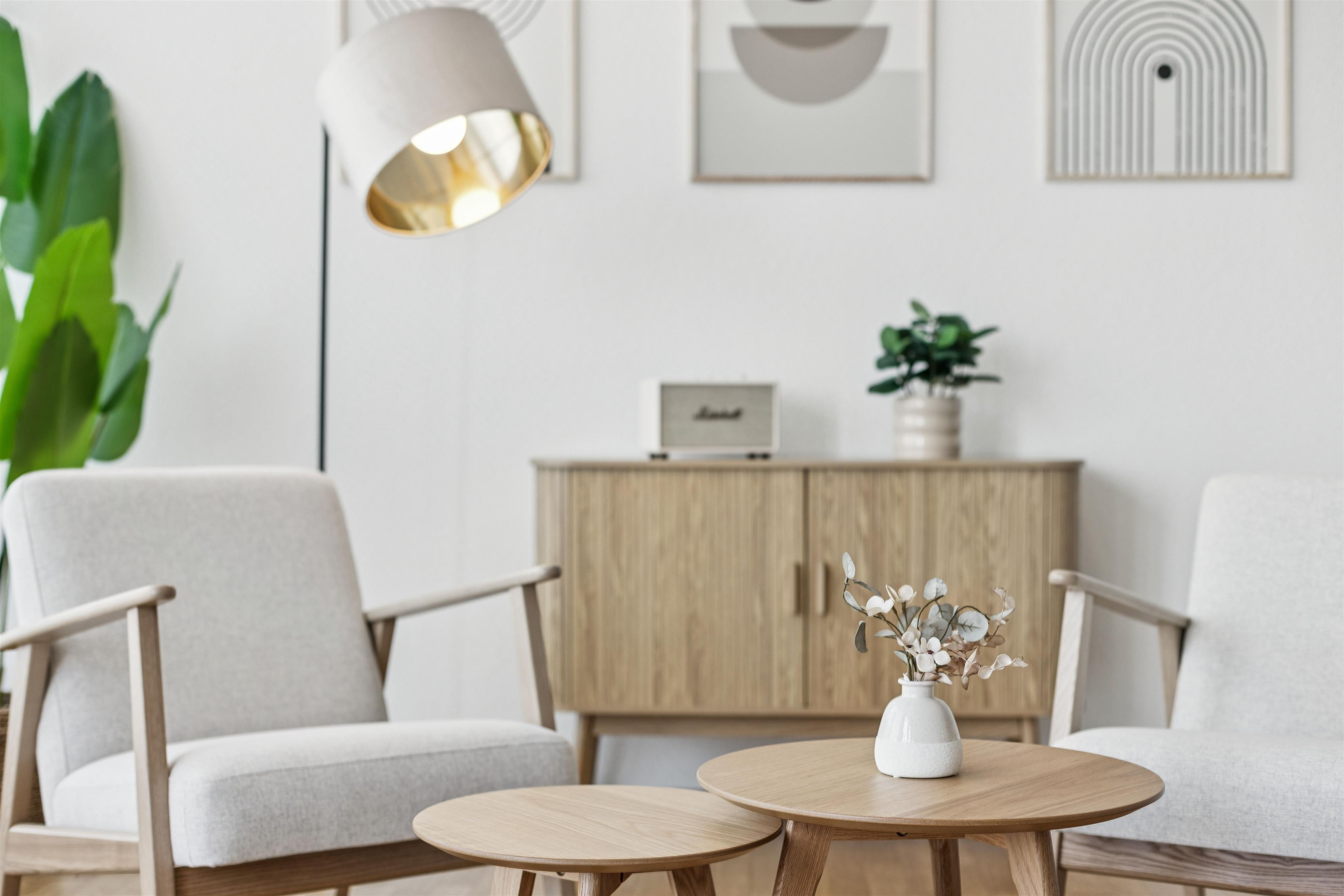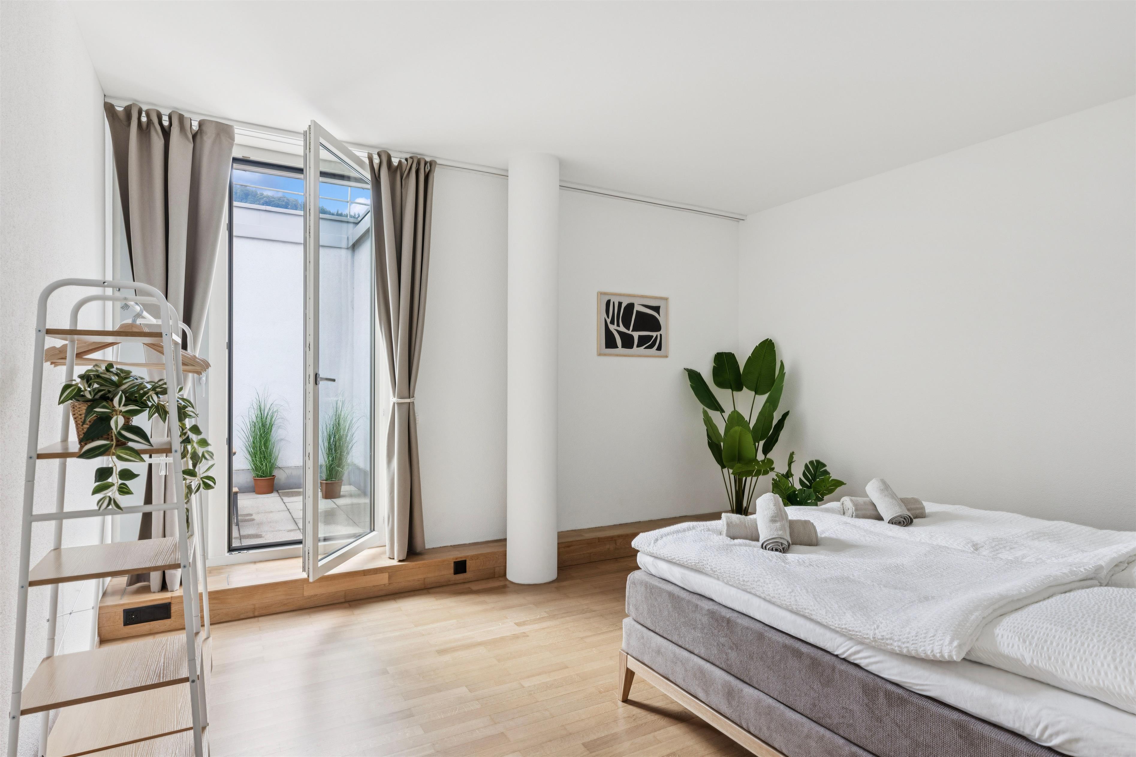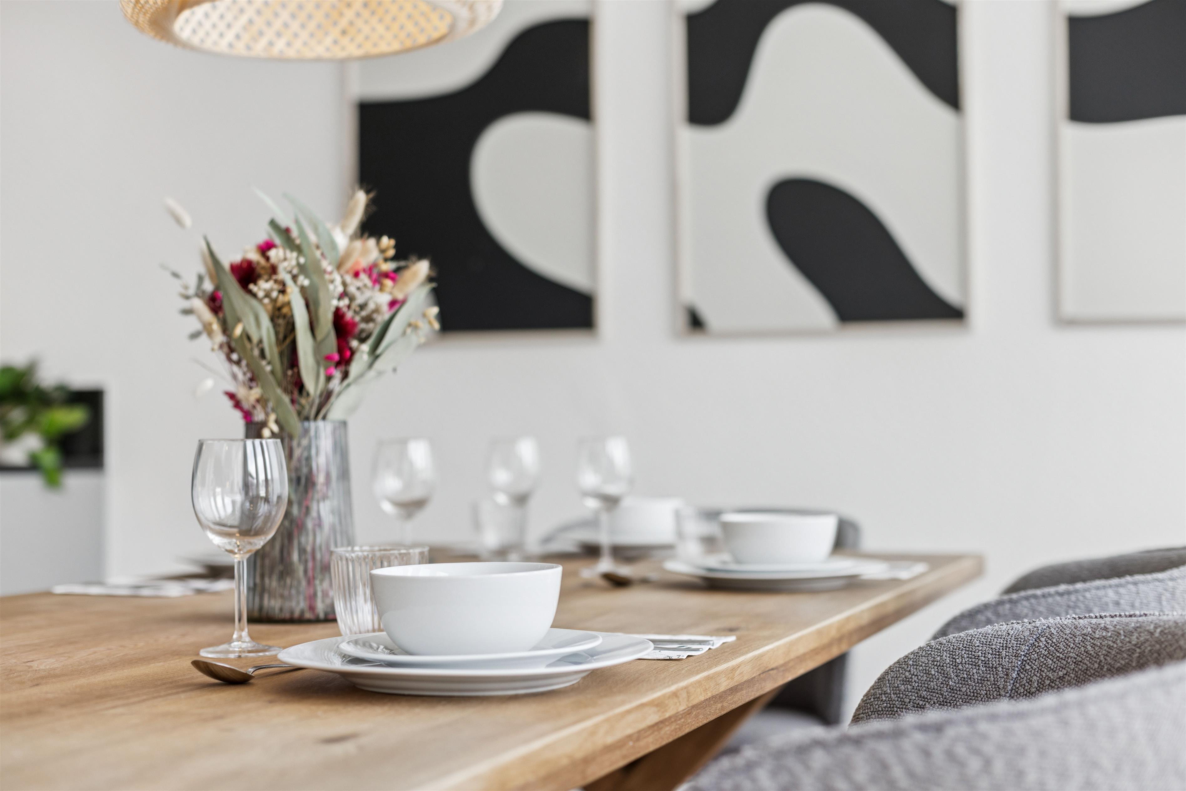 Inside the flat, amenities such as underfloor heating throughout the flat, a smart TV for cosy evenings and a washing machine and tumble dryer for your sole use ensure a carefree stay. The kitchen is fully equipped with a ceramic hob, capsule coffee machine, kettle, toaster, rice cooker, microwave and dishwasher and invites you to cook together.