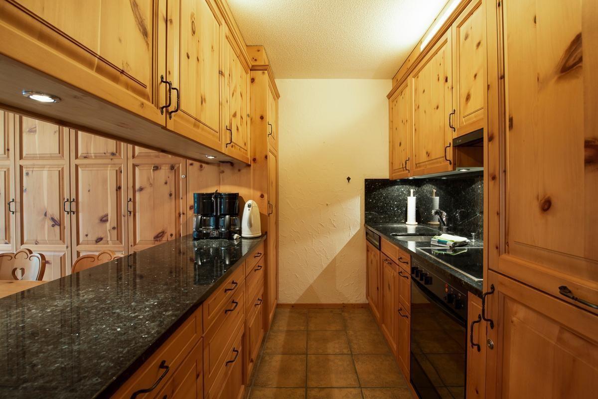 The interior of our 1 ½ room flat, designed exclusively in Swiss stone pine, leaves nothing to be desired. A double bedroom separated by a Swiss stone pine wall guarantees you a peaceful night's sleep. The south-facing, spacious living room invites you to linger with its fireplace, cosy upholstered suite and dining table. The flat is tastefully furnished and offers optimum comfort for a couple without children. The kitchen equipment includes an electric cooker, dishwasher and coffee machine. For your convenience, there is a coin-operated washing machine/tumbler in the basement.