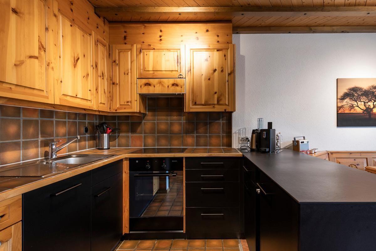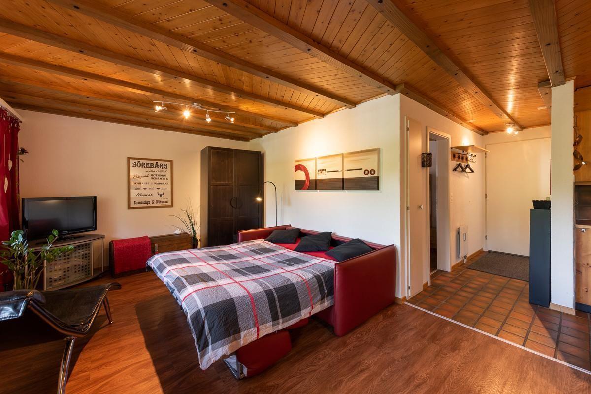 With its sunny location in a charming chalet, the flat exudes comfort and cosiness. It is a 2 ½ room flat with a bedroom with 2 bunk beds (for 4 people) and a living room with a double sofa bed. The living room is furnished with a cosy dining table next to the open kitchen, which can seat up to 6 people. The equipment also includes a large fridge, a 4-ring ceramic hob, dishwasher, TV and WLAN. A fondue caquelon, a fondue bourguignon rechaud and a Nespresso coffee machine (capsules available in the local supermarket) are available for cosy evenings.