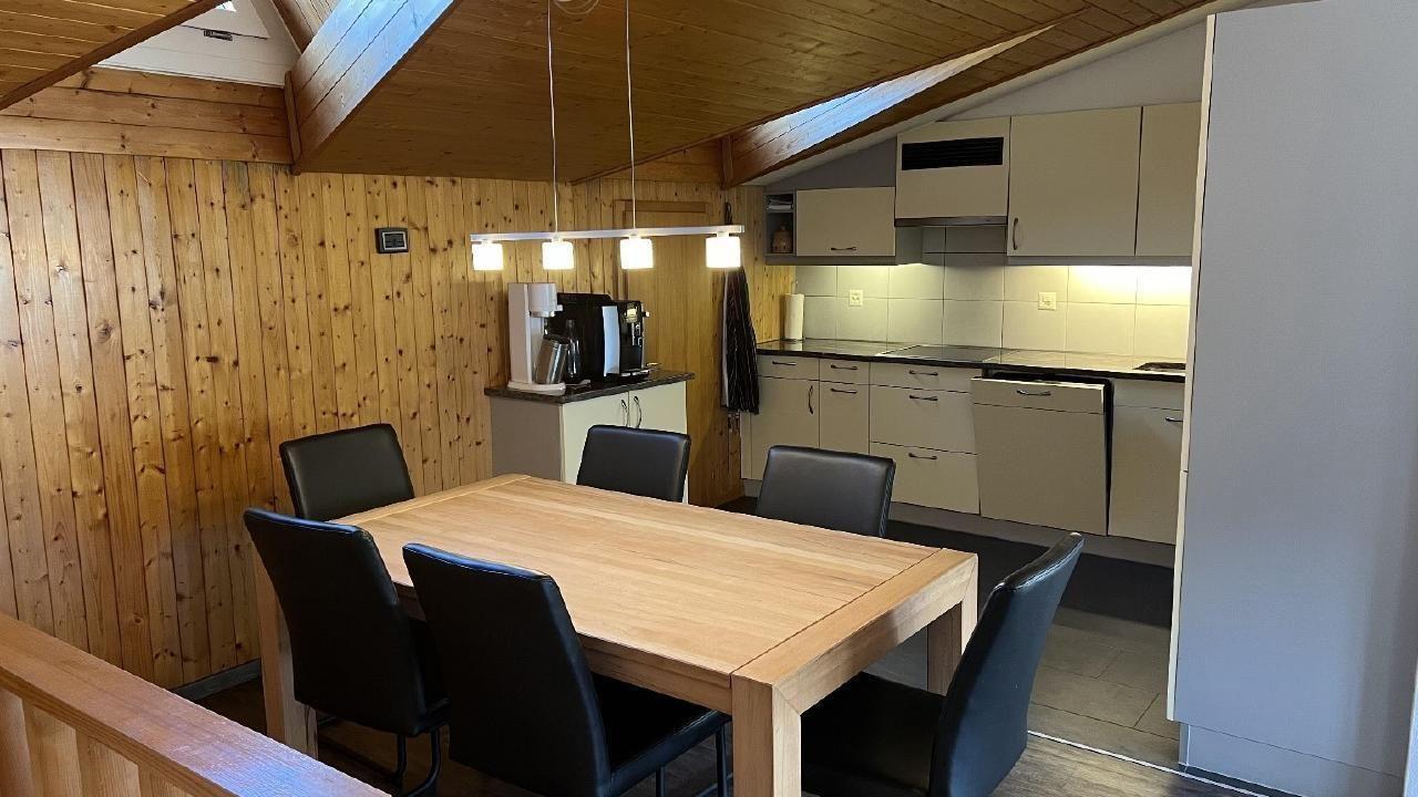 Inside, you will find a spacious 5 1/2-room flat specially designed for families. A vestibule welcomes you, followed by an entrance area that leads to three cosy bedrooms and two bathrooms (one with shower/WC and one separate WC). A staircase leads to the upper floor, where you will find an attractive living and dining room with an inviting fireplace and the open-plan kitchen. There is also an additional fourth bedroom under the roof.