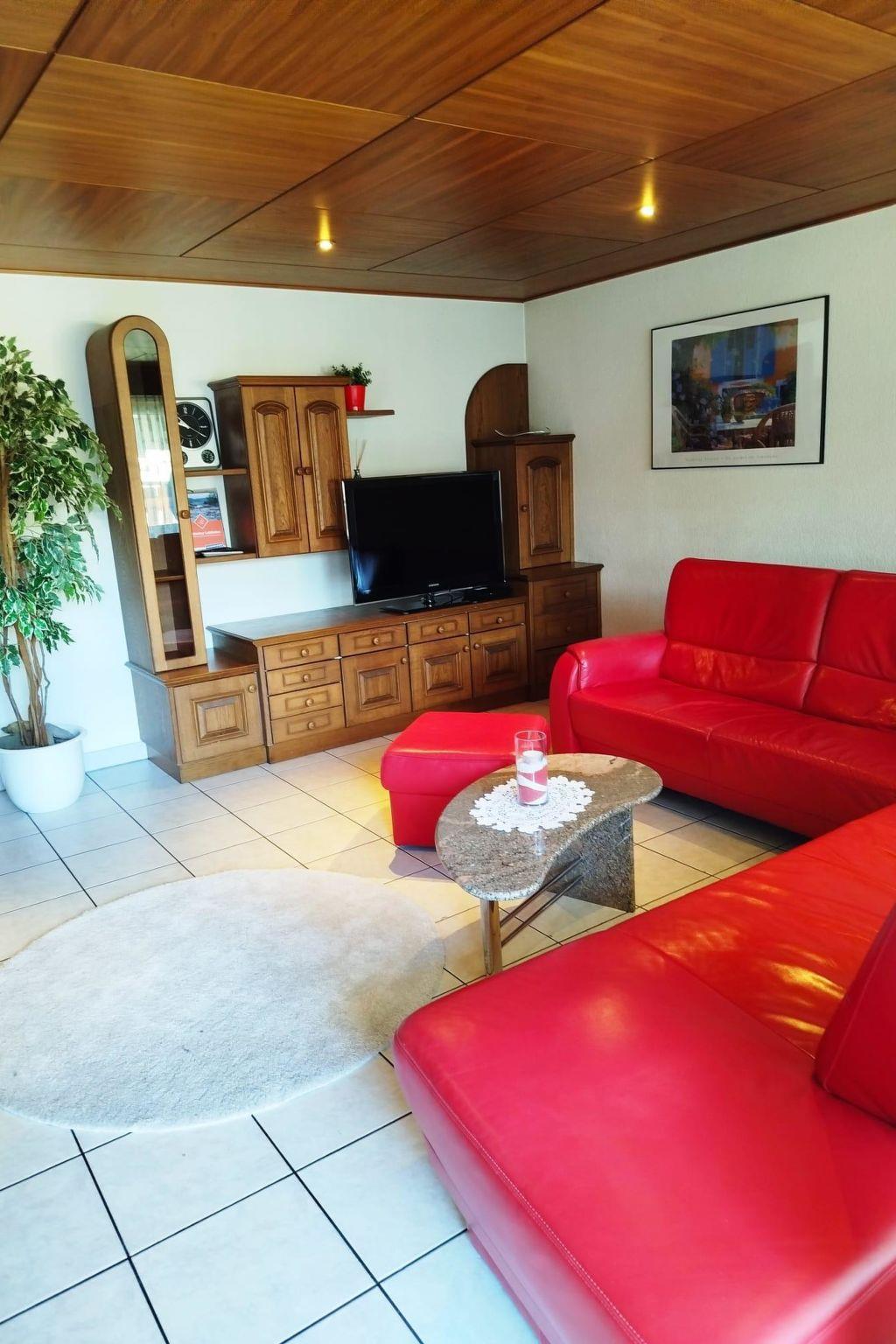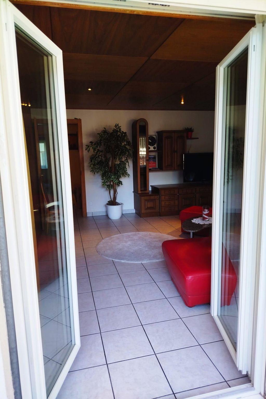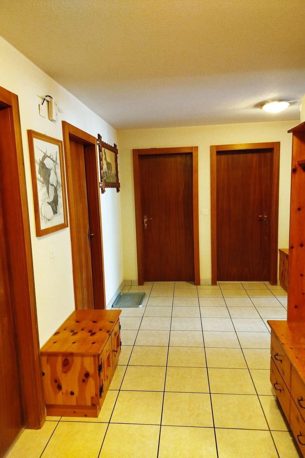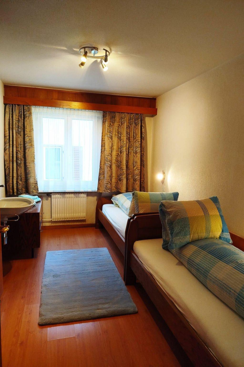 The 5.5 room apartment features 4 bedrooms, 1 living room, 1 kitchen and 2 bathrooms. All rooms can be accessed from a spacious hallway. The apartment has two bathrooms (1st with shower and toilet, 2nd with bathtub, toilet). Each bedroom offers ample storage space for your clothing and also has a sink and a mirror; some rooms have a desk & chest of drawers. Two bedrooms are equipped with double beds (180 x 200 cm and 160 x 200 cm). Two other bedrooms offer single beds (1-bed and 2-bed rooms separately). Upon request, a baby cot can be set up for a fee (or we are happy to provide additional children's items). Beautiful views are offered by two balconies on the south and east sides. The kitchen is fully equipped (fridge with freezer, dishwasher, filter coffee machine and fondue set, etc.). Of course, there is a large table with six chairs for you. In the living room, there is a larger corner sofa with a table and a living room wall with a flat-screen TV.