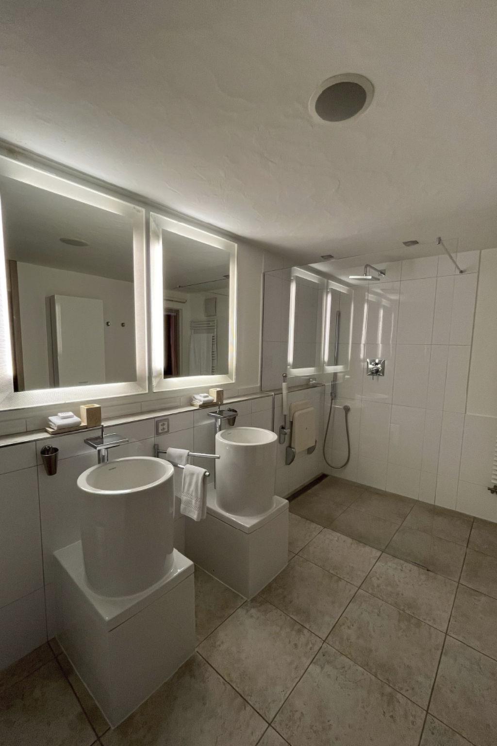 Our Miralux Suite is a unique room that you won't find everywhere. Built into the mountain, the suite features a large window front with an unforgettable view over the valley and the forest. Furnished with bio furniture from Team7, a seating and dining area, as well as a panoramic balcony, this is the perfect place to enjoy your vacation without leaving the room—unless you want to. The spacious bathroom includes a whirlpool and a glass shower and is, as the only room in our hotel, wheelchair accessible. The minibar and coffee bar are complimentary. The suite is located 20 meters from the hotel and has its own entrance, ensuring maximum privacy and a close connection to the surrounding nature.