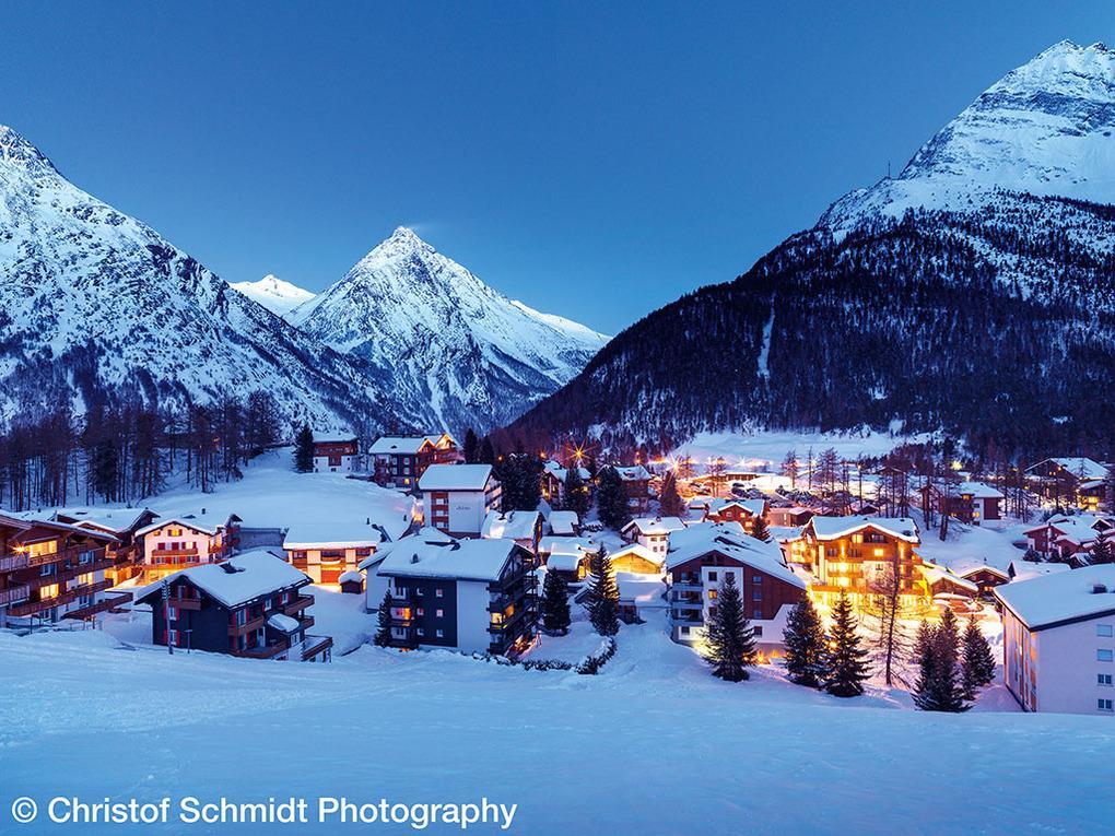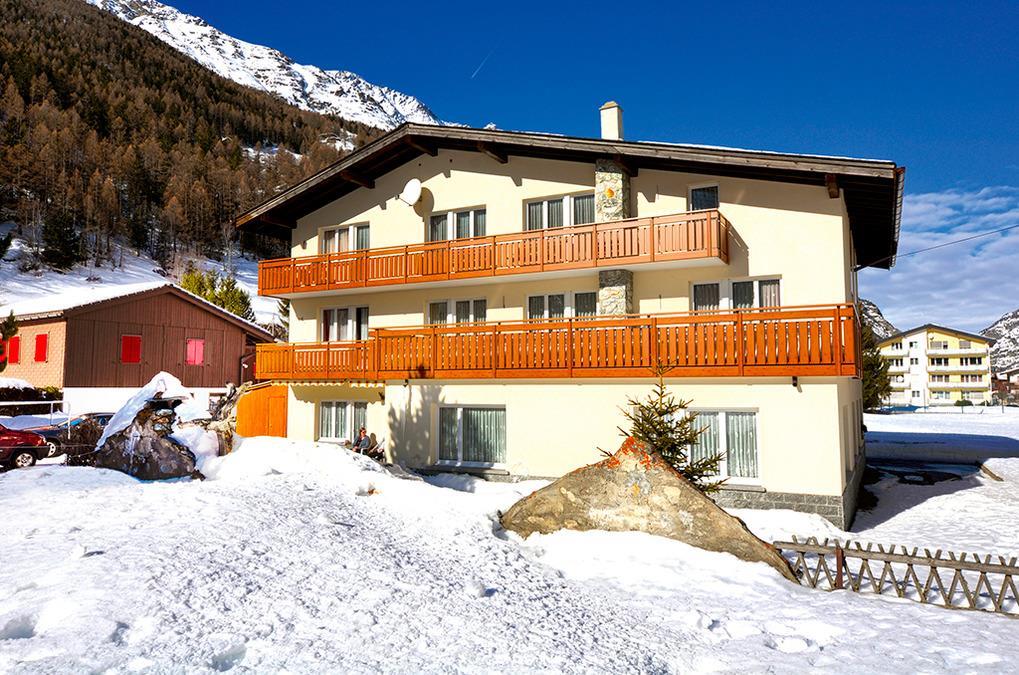 Ort: Saas Grund. Ruhige Lage mit schönem Blick auf die Bergwelt des Saastals. Ortsmitte 300 m. Gondelstation 700 m. Skibus 150 m.