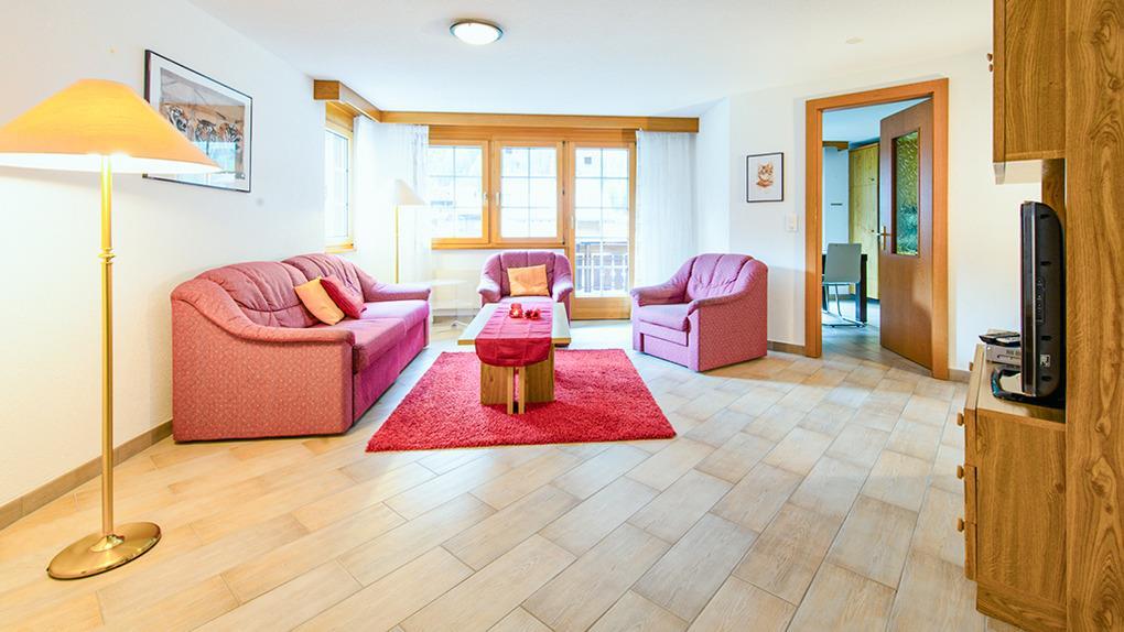 CH 291.34 Wohnung 1-6 Pers.: 4 1/2-Zimmerwohnung mit 120 qm Wohnfläche, 2. Etage. Schöner Wohnraum mit gemütlicher Sofa-Sitzgruppe, Flachbild-TV, Radio/CD, Esstisch, Balkon. Küchen-/Essraum mit Esstisch, Küchenzeile (Backofen, Spülmaschine). Drei Doppelzimmer, davon zwei mit Balkon. Zwei Bäder: Bw bzw. Du, Wb, WC.