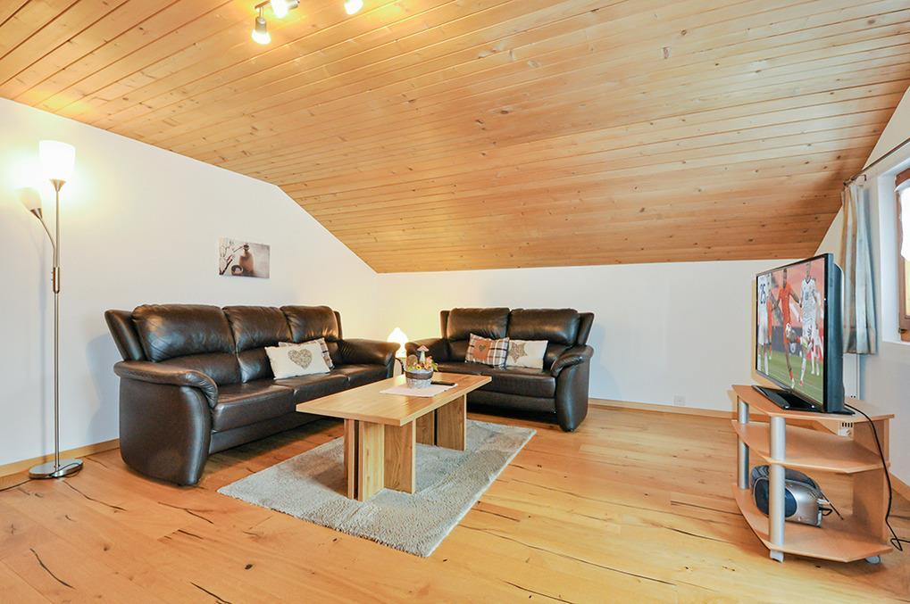 Haus: Regionaltypisches Chalet mit zwei Ferienwohnungen. Gemütliche Atmosphäre durch schöne Holzvertäfelungen in allen Räumen. Großes Platzangebot. Internetzugang über W-Lan. Nichtraucherhaus. Balkone mit Sitzmöbeln, schönem Blick auf die umliegende Bergwelt. Zentralheizung. 2 Pkw-Stellplätze pro Fewo.