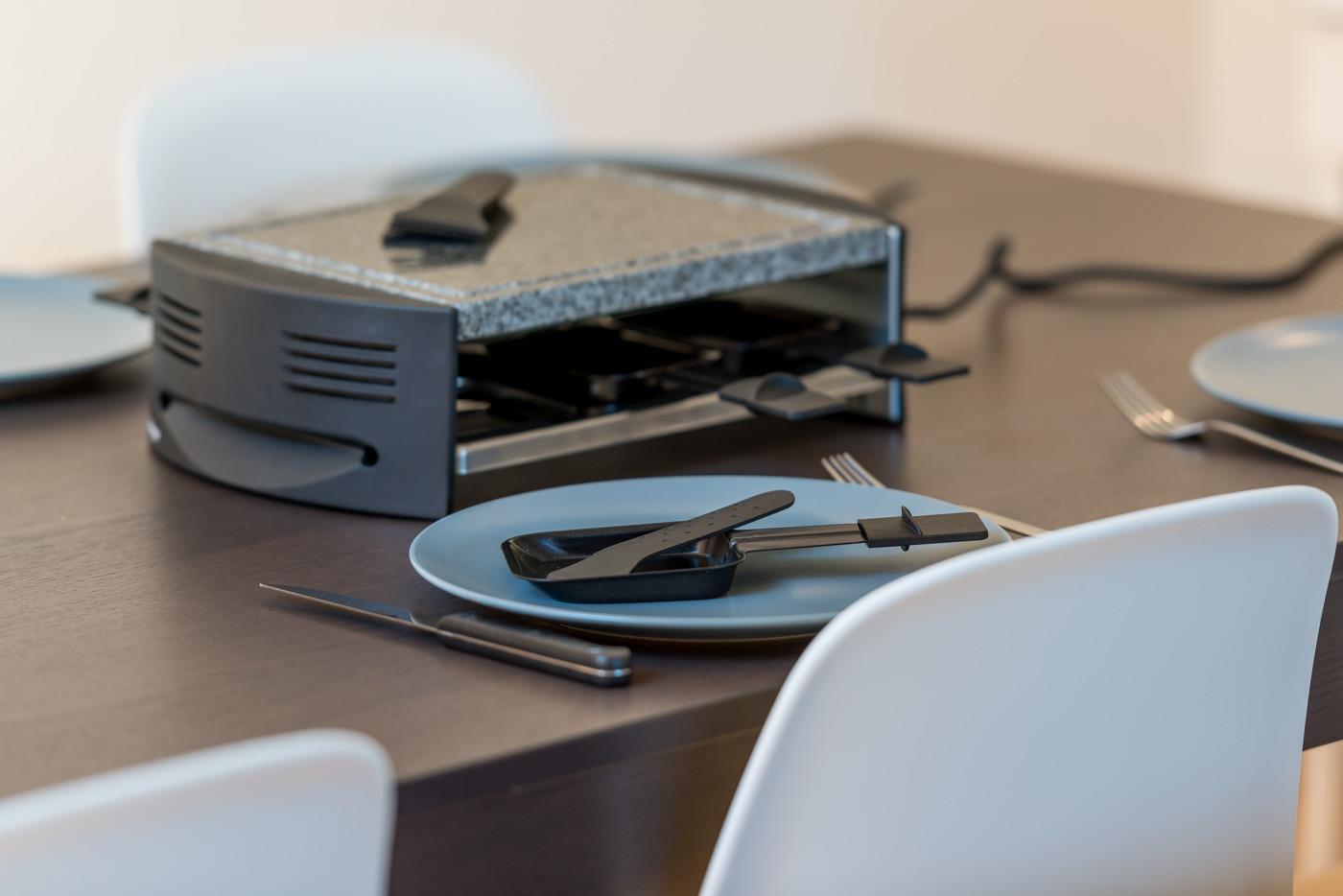 Die modernen Wohnungen sind geschmackvoll, gut und hell eingerichtet, sehr gute Ausstattung. Jeweils Kabel-Flat-TV (Apple-TV) und Radio. Die Küchen sind sehr gut und vollständig ausgestattet mit Einbauherd (4 Veranfelder), Backofen, Mikrowelle, Geschirrspüler, Kühl-/Gefrierkombination, Filter-Kaffeemaschine, Nespresso-Kapsel-Kaffeemaschine, Wasserkocher, Toaster, Fondue-Rechaud und Raclette-Gerät. Holzdielenböden im Wohnraum und Schlafzimmern mit Fußbodenheizung. Jedes Bad mit Haartrockner.