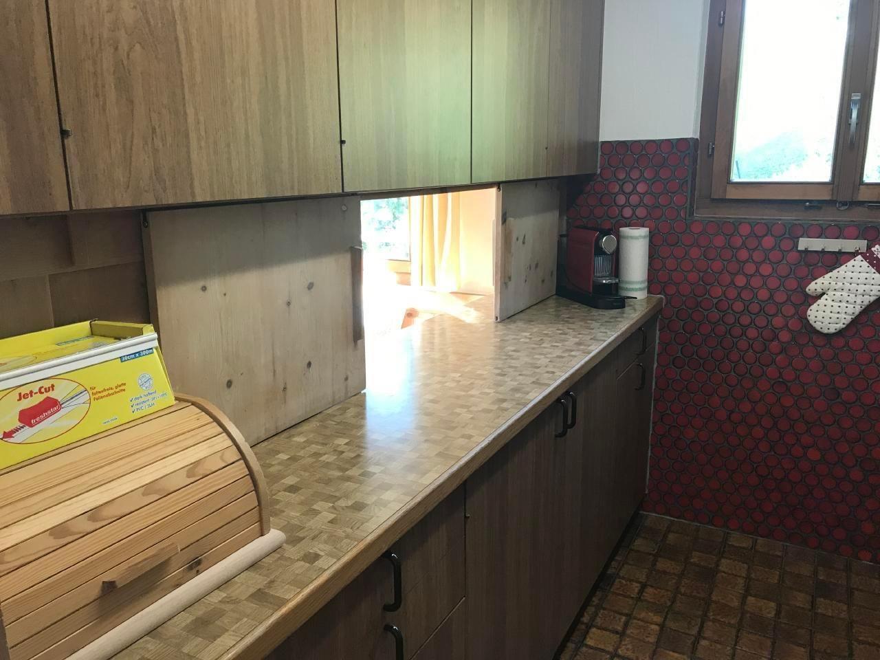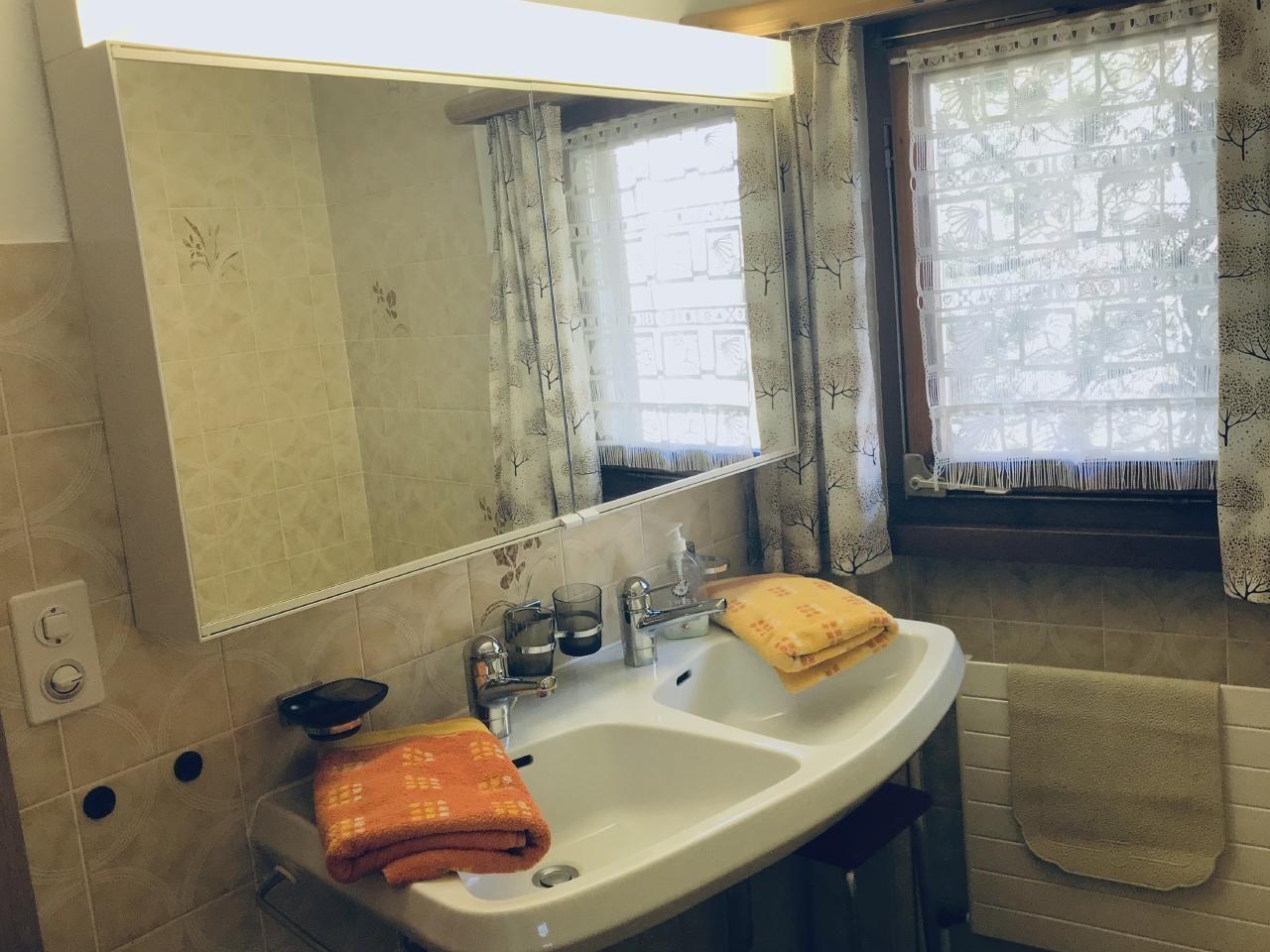 Inside, the flat is lovingly furnished, combining tradition with comfort. Entire rooms are furnished with fine Swiss stone pine furniture, creating a cosy ambience. The living room with an upholstered suite and dining area invites you to spend cosy evenings. Technical equipment such as TV, CD, radio and an Internet connection provide entertainment and information. The partially renovated kitchen is equipped with a ceramic hob, while the sleeping areas with a double bedroom including direct access to the bathroom/WC and a further bedroom with two single beds and separate shower/WC offer every guest privacy and comfort.
