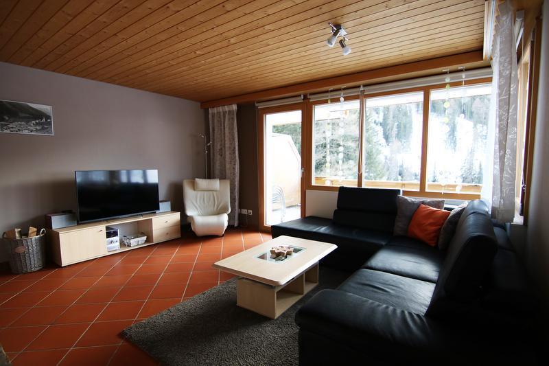 Wohnzimmer mit Radio, TV, Kamin und grossem Balkon. Im EG befindet sich ein beheizter Skiraum. Gegenüber des Hauses befindet sich der dazugehörige Parkplatz.