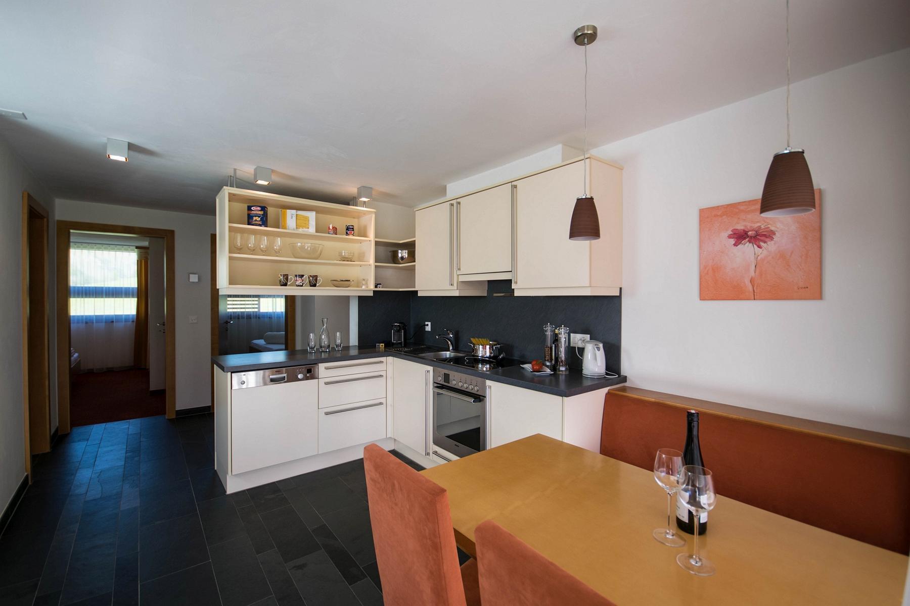 New, high quality furnished three-room apartment for 4-5 people (70m2), 2 bedrooms, 2 shower / toilet, the living room is furnished with natural slate floor, large terrace with south view, patio, flat TV, radio, W-Lan free, telephone, safe, hair dryer, dishwasher, oven, Nespresso and filter coffee machine, kettle, bread service. The 1st House on the slope to the cable car, which you can reach in a few minutes.