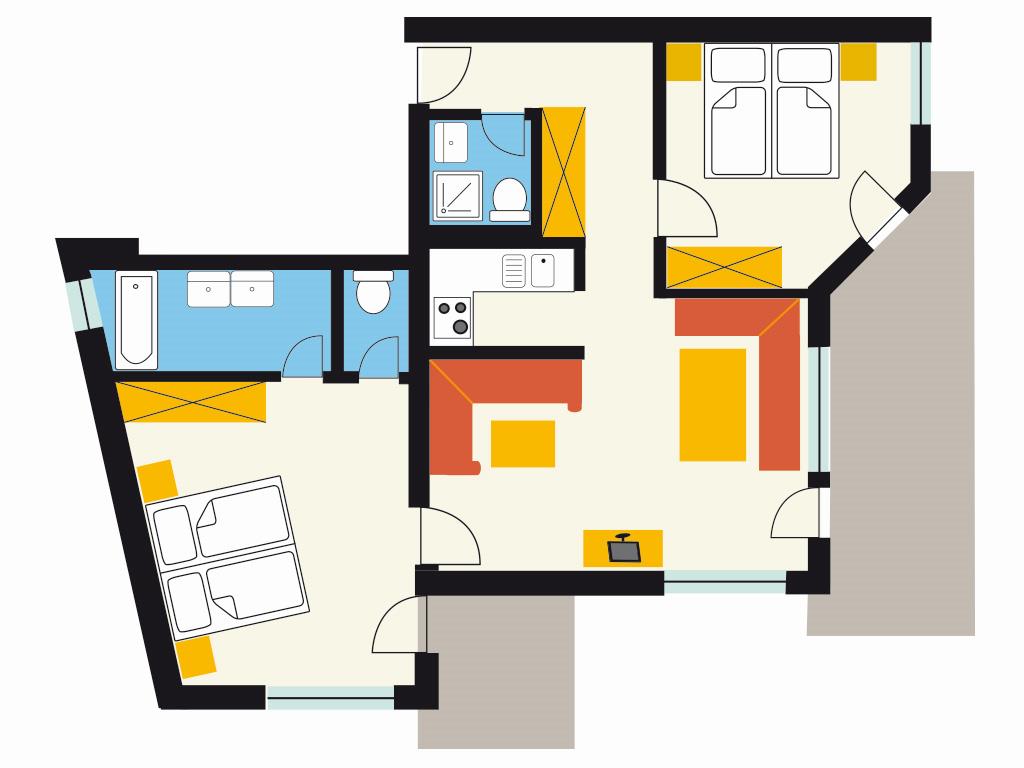 70m2, livingroom with sofa and little table, bench seat with dining table, two separate double rooms, kitchen with 3 plate stove and oven, fridge etc.