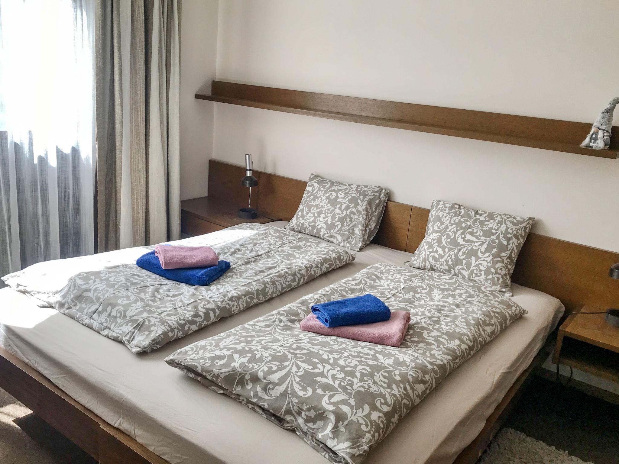 "Panorama View 905", 2-room apartment 49 m2 on 9th floor. Object suitable for 2 adults + 2 children. Spacious, comfortable and cosy furnishings: living/sleeping room with 1 sofabed (140 cm, length 190 cm), dining table, cable TV, flat screen and radio. Exit to the balcony. 1 double bedroom with 1 double bed (2 x 90 cm, length 200 cm). Small kitchen (4 hot plates, oven, toaster, kettle, electric coffee machine, Capsules for coffee machine (Nespresso) extra). Bath/WC. Small balcony, south facing position and west facing position. Balcony furniture. Marvellous panoramic view of the mountains, the countryside and the resort. Facilities: hair dryer. Internet (WiFi, free). Please note: non-smokers only. Maximum 1 pet/ dog allowed.