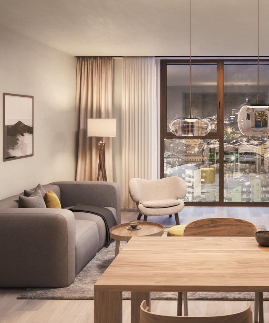 The San Bernardino Alpine Apartments comprise a total of 55 finely furnished flats in three exclusive residences, Castanea, Larix and Tilia, where the concept of alpine living is reinterpreted and celebrated with passion in a beautiful mountain landscape in the green area of Pian Cales. The flats offer numerous services, a unique concierge service, access to a wellness and spa area, ski and mountain bike storage.