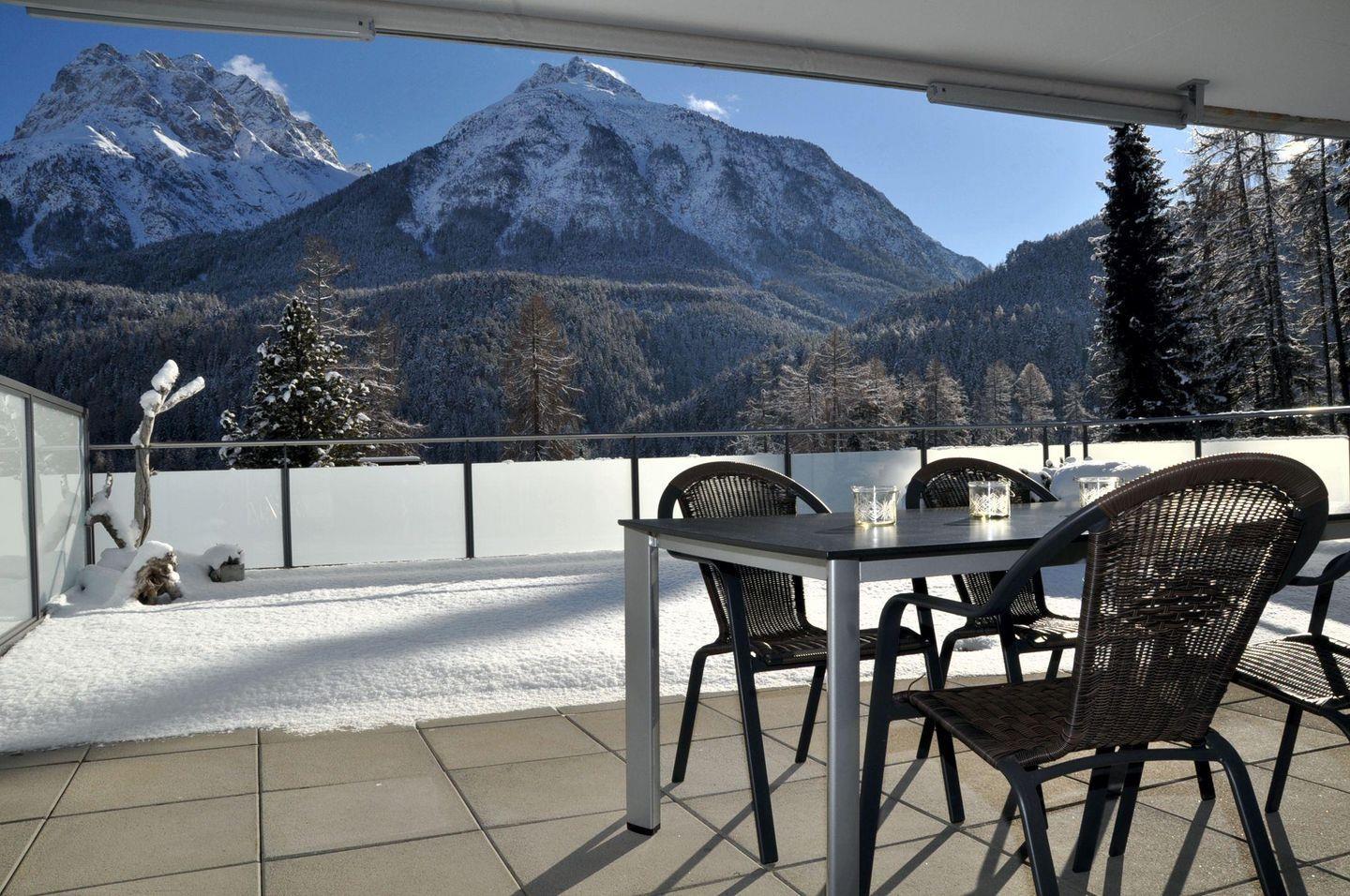 A luxurious, beautiful terrace flat awaits you here in a sunny and central residential location. From the huge - partly covered - south-facing terrace (59 m2) you can enjoy a marvellous panoramic view of the Lower Engadine mountains.