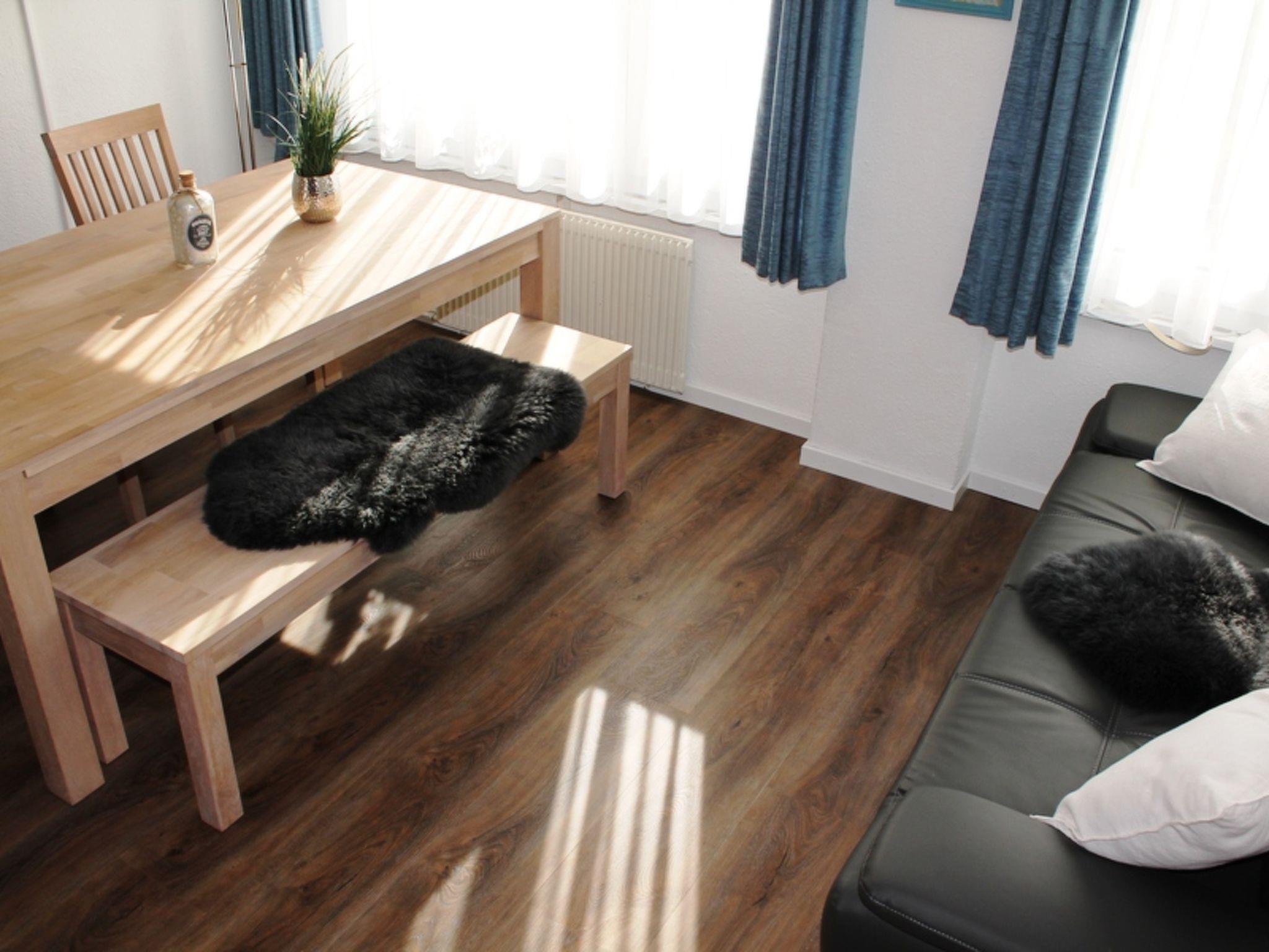60 m2. 1 pet/ dog allowed. More information by the provider: 3-room apartment on the ground floor, south facing position. Comfortable furnishings: living / dining room with dining table and satellite-TV. Open kitchen with 4 hotplates, oven, ceramic glass hob). 2 bedrooms: 1 room with double bed and 1 room with 1 single bed and 1 bunk bed (2 beds). Bathroom with bath tub with shower / WC. Large garden seating area with terrace furniture. View of the mountains and the countryside. Parking place. Visitor's tax and bed linen are included in the rate. Bath and kitchen towels are provided and included. In the house is 1 dog allowed. Flooring: parquet
