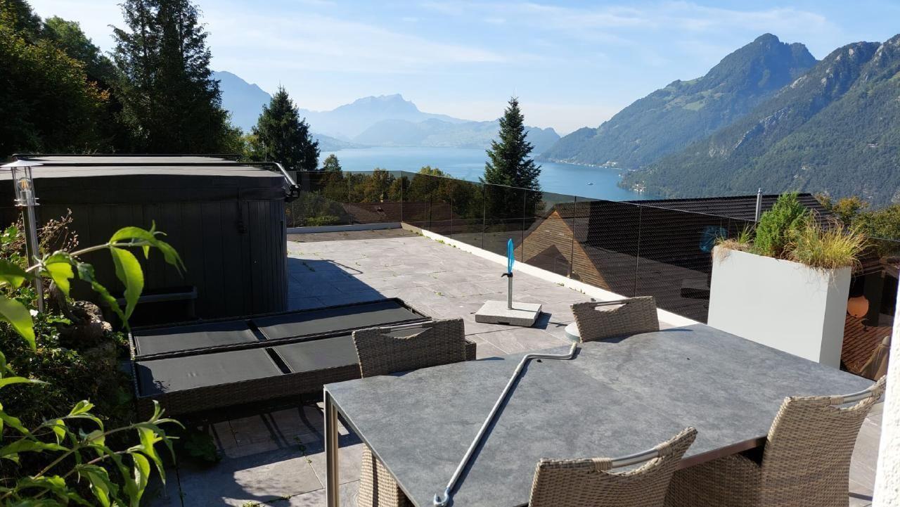 Our villa is situated directly above Lake Lucerne with a unique panoramic view of the lake and the mountains (Pilatus and Rigi)