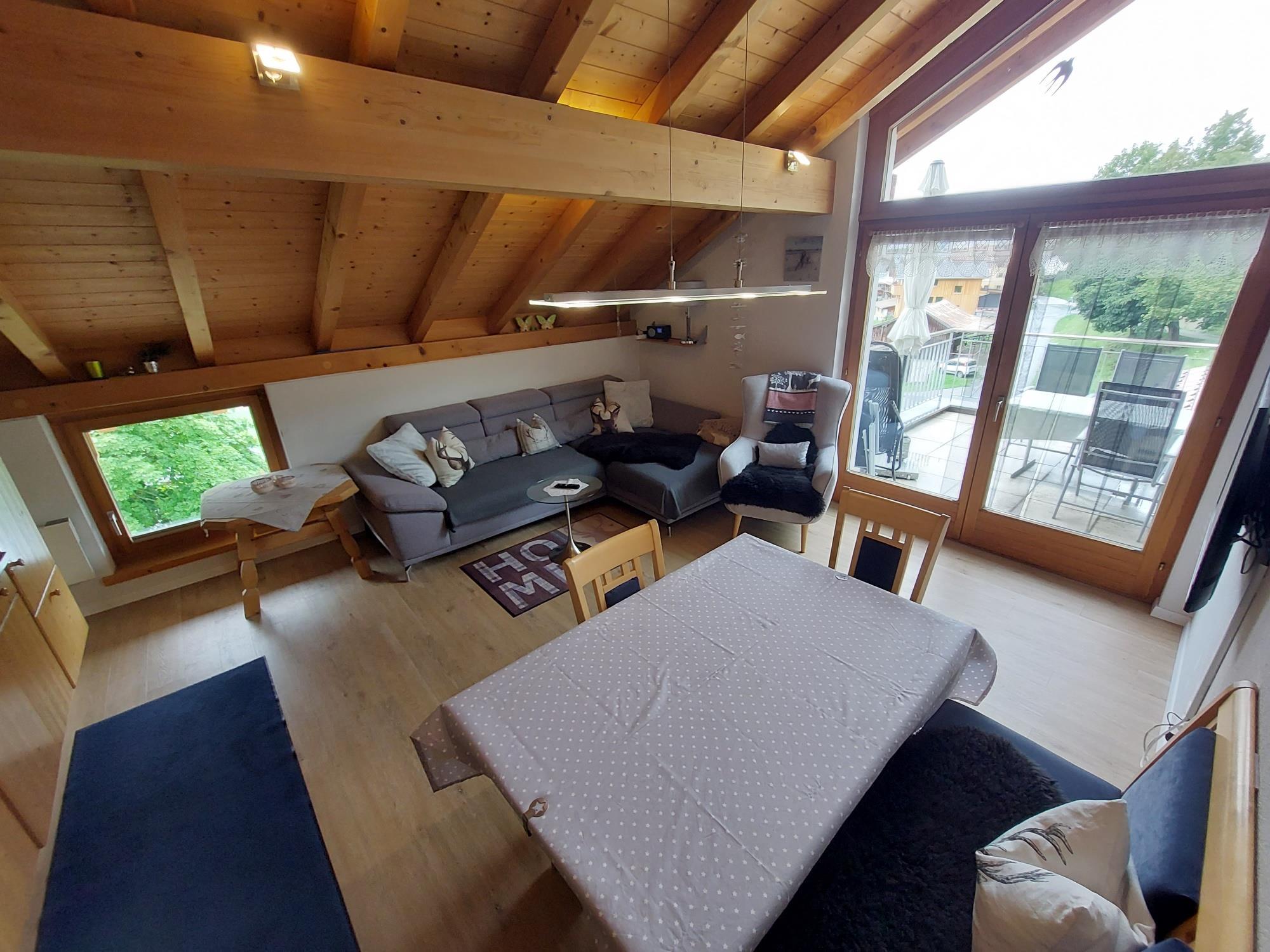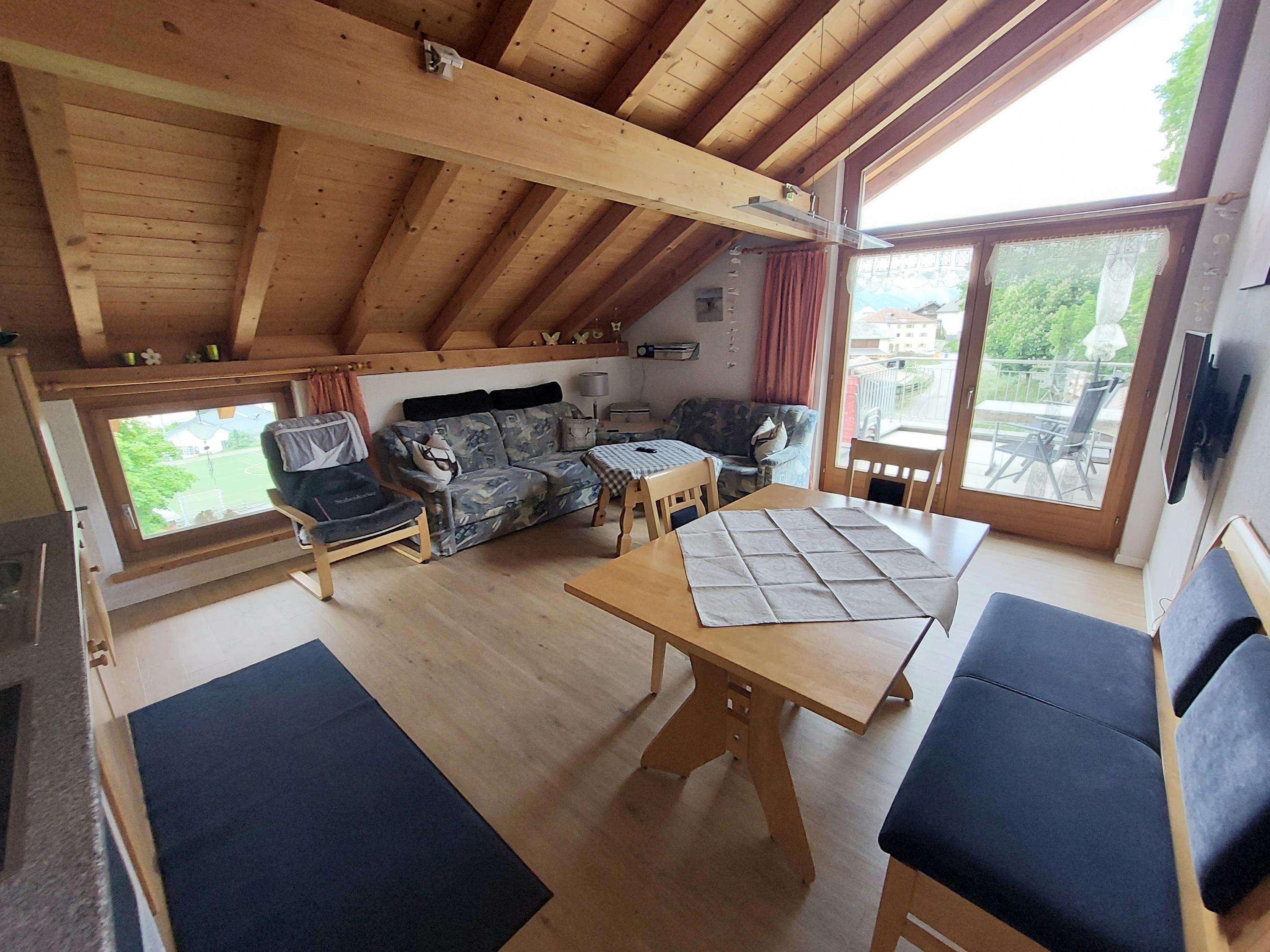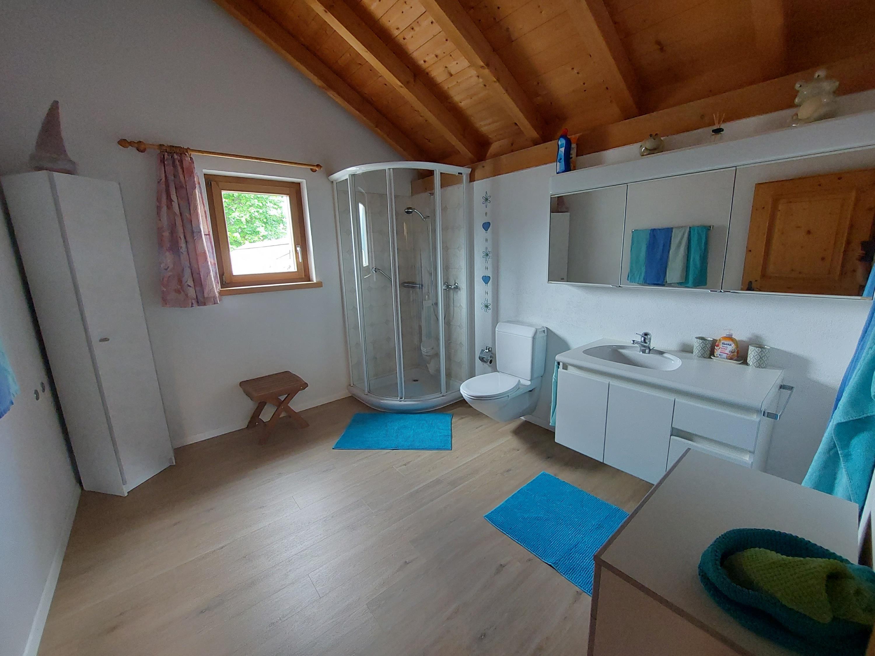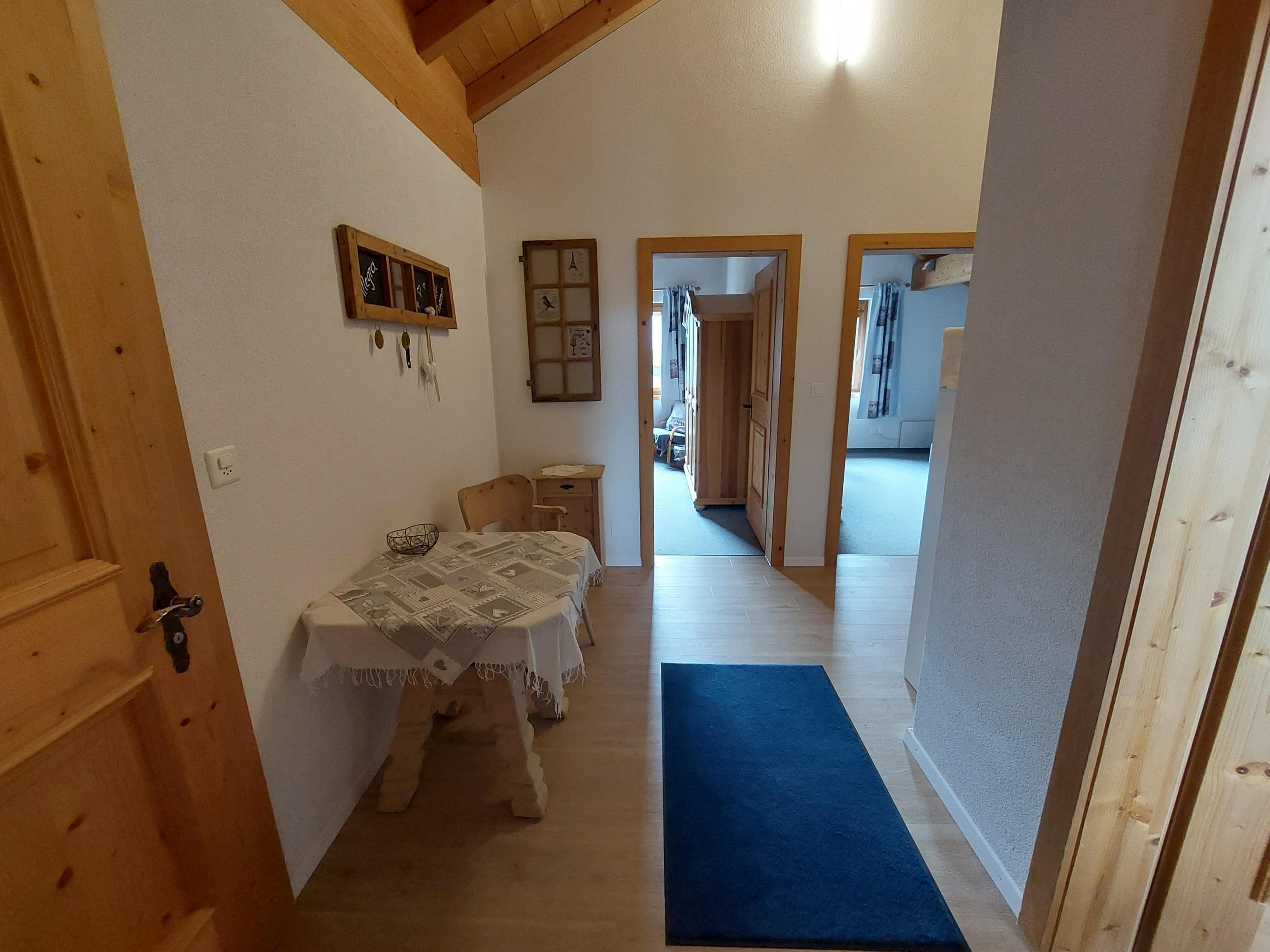 New, comfortable, 4-stars apartement with 3 ½ rooms in a sunny and quiet place with a splendid view. Only 5 minuts walking distance from the centre, direct on the ski run. Starting point for different hiking tours. Big privat patio, parking places in front of the house, playground, sport and ice skating place next to the house. Free mountain bike and sleigh ride. New, bright, roomy, 3 1/2 room apartment (****) on the top floor. A special cozy atmosphere thanks to the visible roof rafters. Solid wood kitchen. Living room with a comfortable sofa/bed. Radio/CD, TV with satelite, telephone, 2 double sleeping rooms (with an extra bed), shower, toilette, hall, balcony and private garden sitting area.