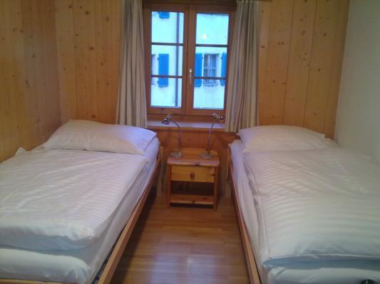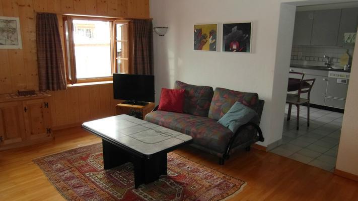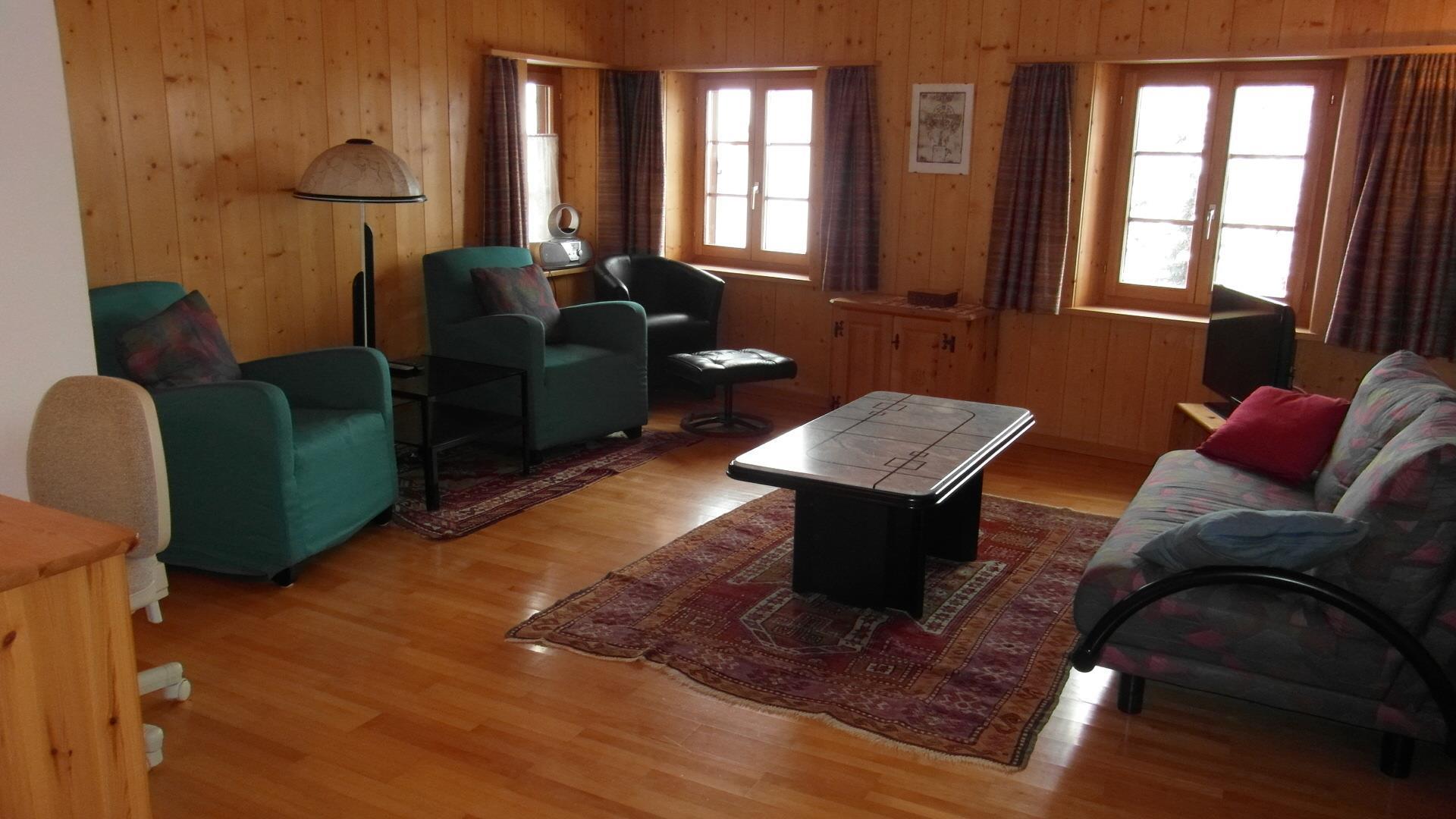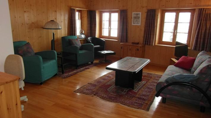 The holiday apartment for six people in House Tredeschin includes a 3 1/2 room apartment with 2 bedrooms, kitchen, living room and WC/bath as well as a seperate studio with bedroom, mini-kitchen and WC/shower. The apartment is in a renovated house in the Engadine style with lovely view of San Peder and the mountains. The apartment offers simple but comfortable furniture. The studio is in the original Engadine style with wooden walls and cieling.