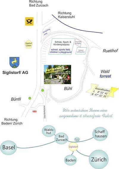 Surroundings: Siglistorf is located on the cantonal border between the cantons of Aargau & Zurich - not far from the spa towns of Bad Zurzach and Baden with their thermal baths and historic town centres (Baden = highest Swiss total mineralisation of 4450mg/l at 46.6°C, Aquae Helveticae).