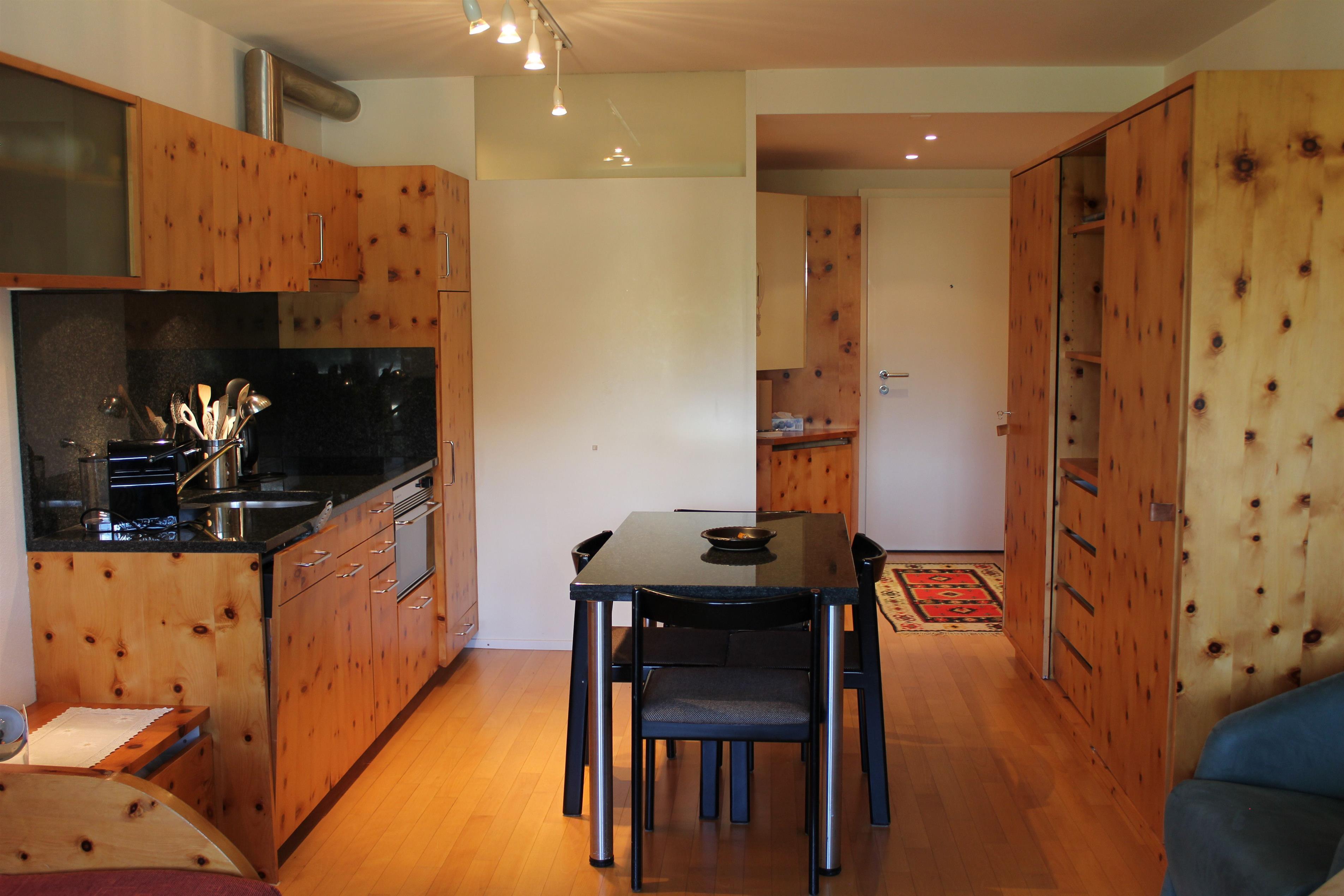 In the flat you will find a cosy living-bedroom, which is furnished with a sofa bed, an armchair, a table, chairs, a TV, radio and wireless LAN. The kitchen leaves nothing to be desired and offers a fridge with a small freezer compartment, an oven, a dishwasher and plenty of crockery, glasses, cutlery and pans. A fondue set and a raclette oven are available for those cold winter evenings. The bathroom is equipped with a shower, toilet and washbasin, all designed for your comfort.