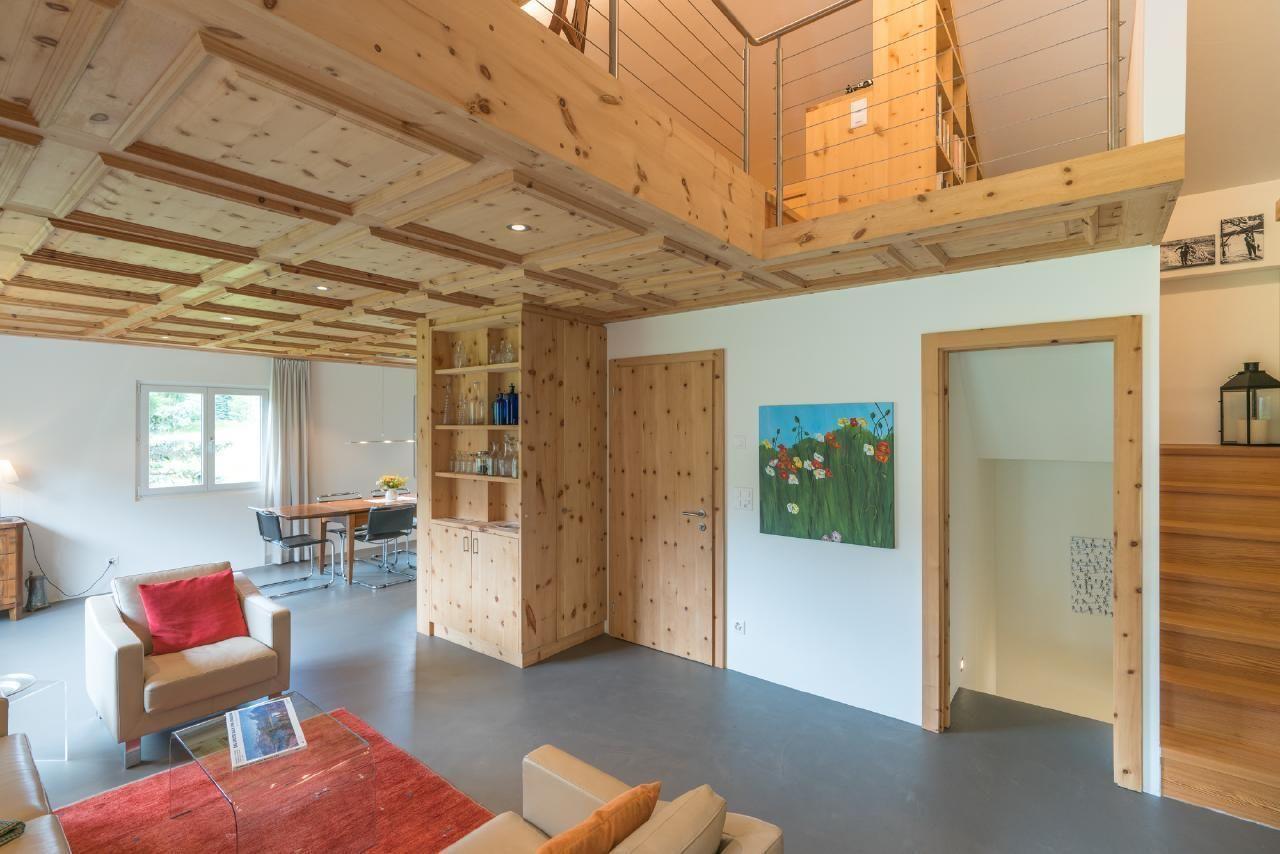 Other living room furnishings (living room 1): Cosy leather upholstered suite, Swiss stone pine wall cupboard, Swiss stone pine coffered ceiling, old memorabilia, WLAN and TV, exit to the sun terrace and sunbathing lawn