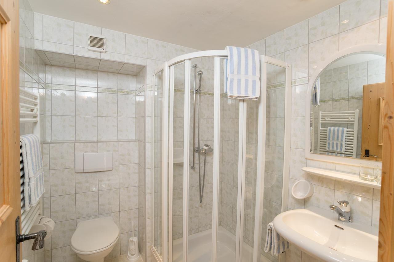 Shower/WC also modern white, 1 washbasin, 1 WC white tiled in the bedroom, 1 separate bath/shower and WC.