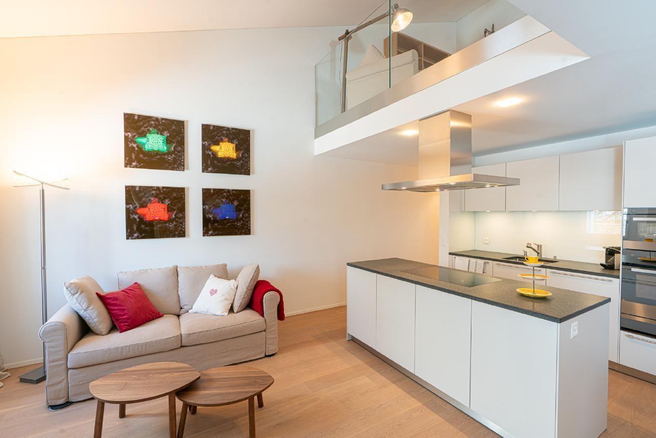 The flat has 2 double bedrooms, 2 bathrooms and a separate WC. The entire flat has parquet flooring. The kitchen is fully equipped. Raclette oven and fondue equipment are available on request. The flat is very sunny. There is a workplace on the gallery for our guests who work from home. The cellar, where the washing machine and tumble dryer are also located, offers enough space for skis and ski boots with dryer, bicycles and the like. There are 2 reserved parking spaces in the underground car park.