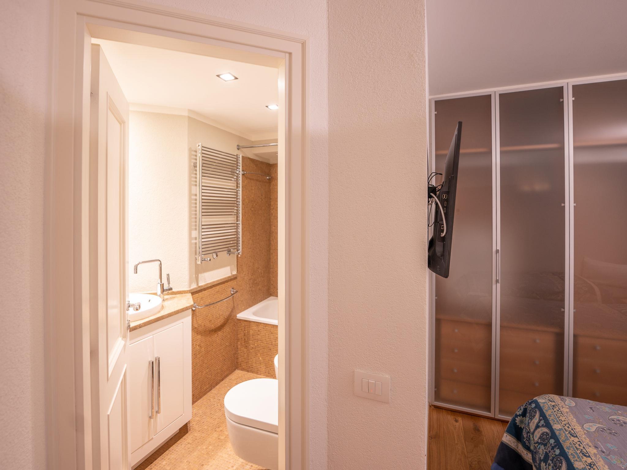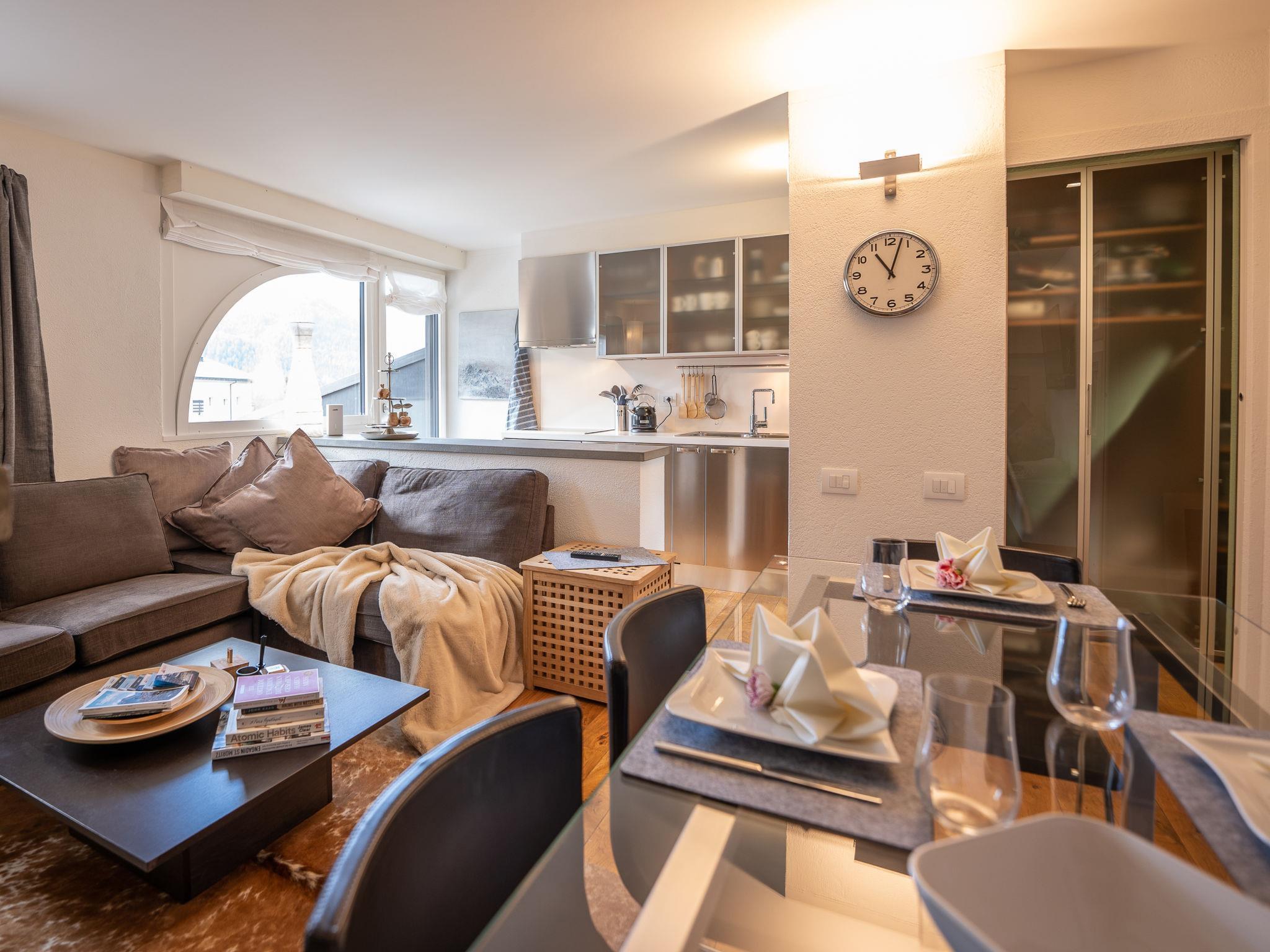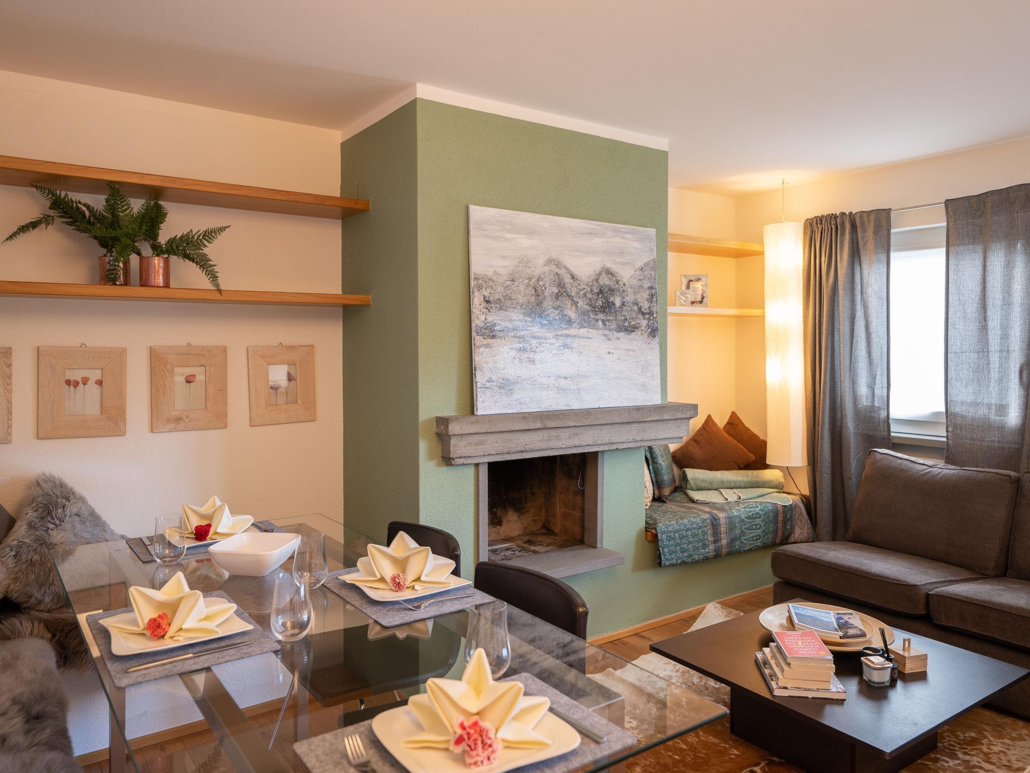 "Chesa Polaschin 4 - Silvaplana", 3-room apartment 74 m2, on the ground floor. Tasteful and cosy furnishings: living/dining room with open-hearth fireplace (only for decoration), TV (flat screen). Exit to the terrace. 1 double bedroom with 1 double bed (1 x 160 cm, length 200 cm), bidet and shower/WC. 1 room, without window with 2 beds (90 cm, length 190 cm), bidet and shower/WC. Open kitchen (oven, dishwasher, 4 ceramic glass hob hotplates, toaster, kettle, freezer, electric coffee machine, Capsules for coffee machine (Nespresso) extra, raclette grill, fondue Set (cheese)). Parquet floors. Terrace furniture. Beautiful view of the mountains and the resort. Facilities: iron, hair dryer. Internet (WiFi, free). Garage space n Nr. 33/34 at 200 m, height 200 cm, width 210 cm. Please note: non-smokers only, non-smoking house. Maximum 1 pet/ dog allowed.