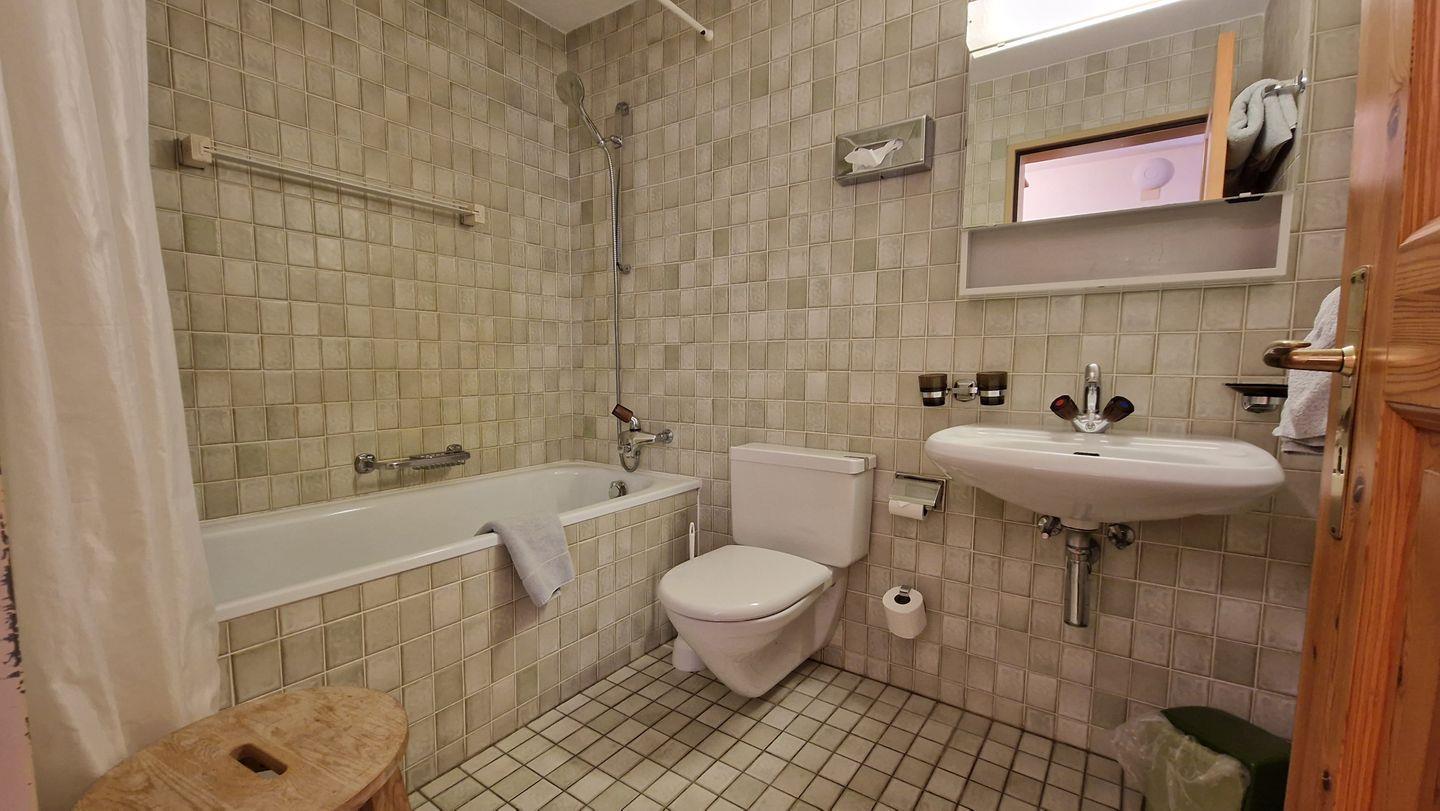 1 1/2-Zimmerwohnung im Haus Rizza, 2. Stock, 45 m2. Das ruhige Studio bietet ein helles, gemütliches Wohn-/Esszimmer mit zwei Schrankbetten (95 x 200) und ein Bad/WC. Die kleine Küche hat eine Durchreiche und ist mit Backofen, Geschirrspüler, Nesspresso-Kapselmaschine und Wasserkocher ausgerüstet. Der nach Süden ausgerichtete Balkon ist windgeschützt und offenbart eine schöne Bergsicht.