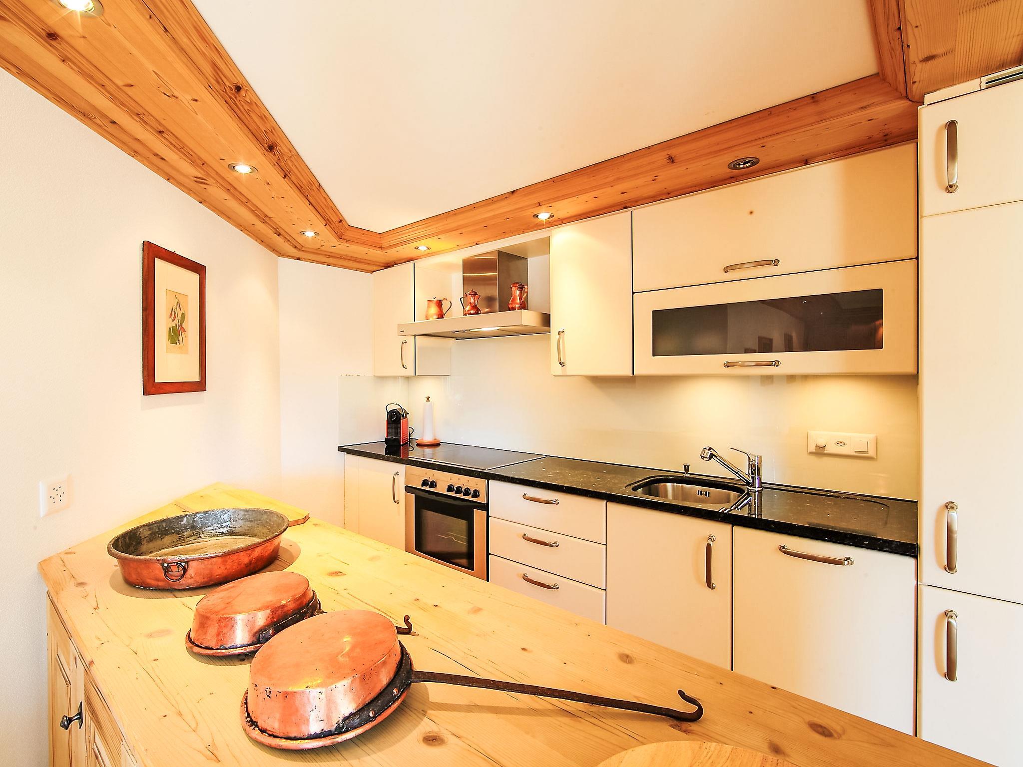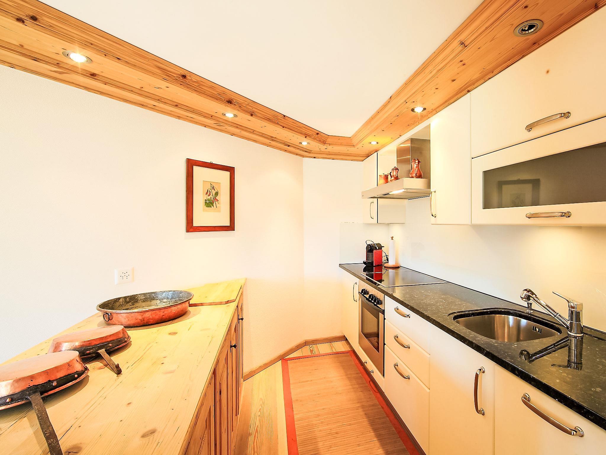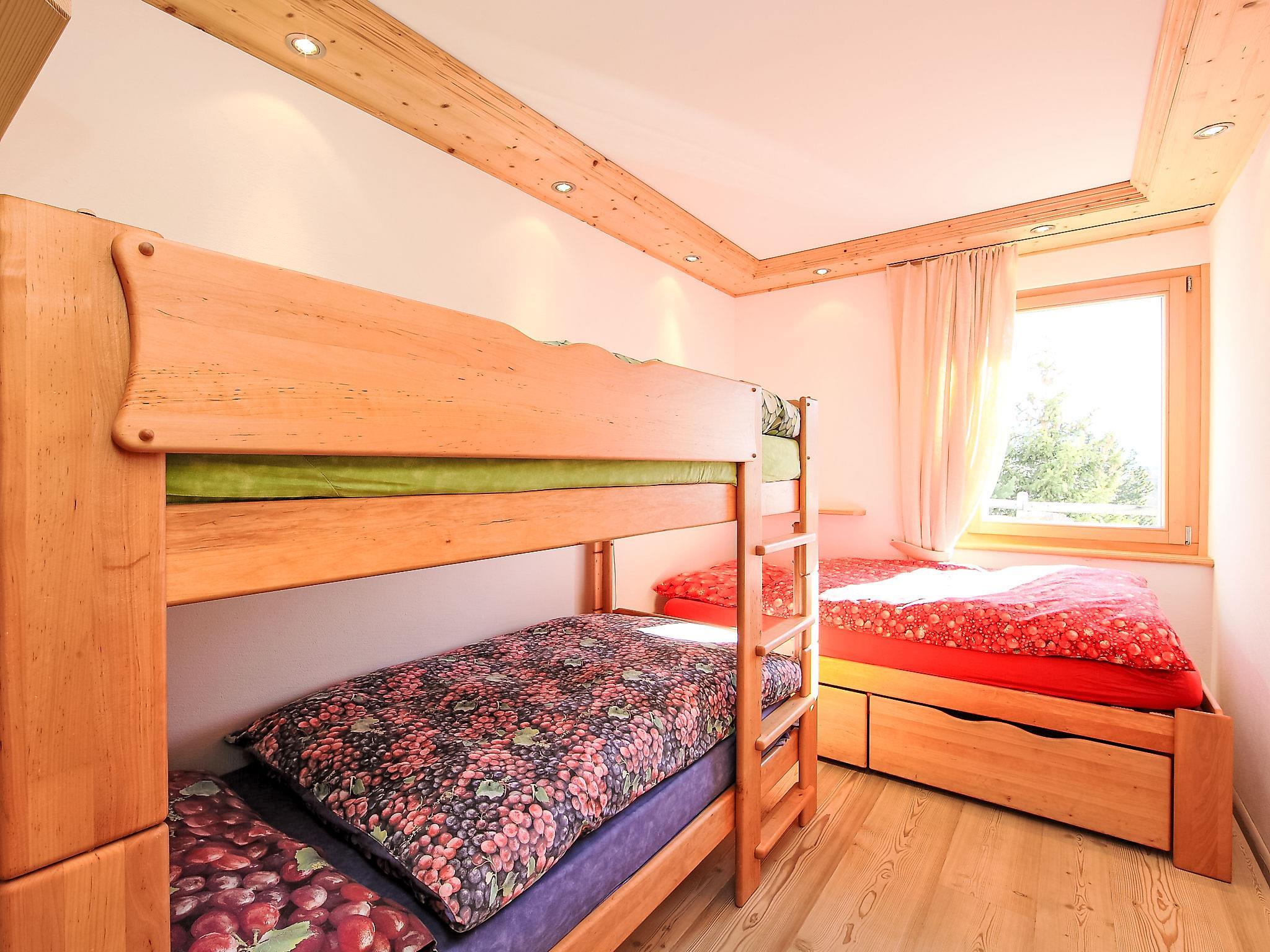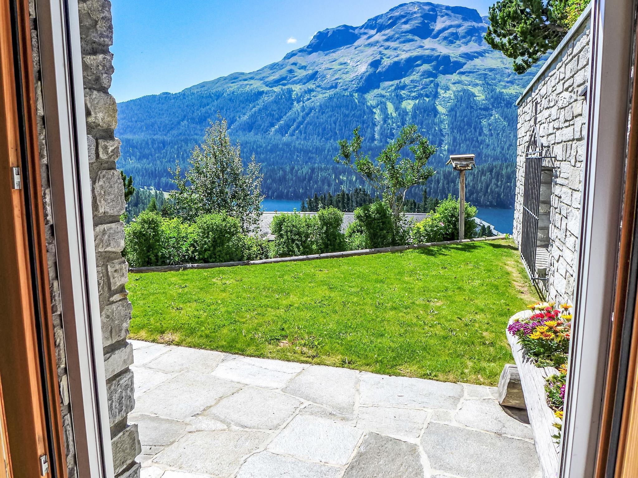 "Chesa Sül Muot", 4-room apartment 100 m2, on the ground floor, south facing position. Very luxurious and cosy furnishings: living/dining room with cable TV (flat screen), radio and DVD. Exit to the garden, to the terrace, south facing position. 2 double bedrooms, each room with 1 french bed (1 x 160 cm, length 190 cm). 1 children's room with 1 bed (90 cm, length 195 cm), 1 x 2 bunk beds (90 cm, length 195 cm). Open kitchen (oven, dishwasher, 4 ceramic glass hob hotplates, toaster, kettle, electric coffee machine, Capsules for coffee machine (Nespresso) extra, raclette grill, fondue Set (chinoise, cheese)). Bath/WC, shower/WC, hydro massage shower. Floor heating. Wooden floors. Patio, south facing position. Deck chairs (4). Beautiful view of the lake, the mountains, the valley and the resort. Facilities: iron, hair dryer. Internet (WiFi, free). Garage (1 car), height 190 cm, width 220 cm. Please note: suitable for families. Non-smokers only, non-smoking house. Private entrance.