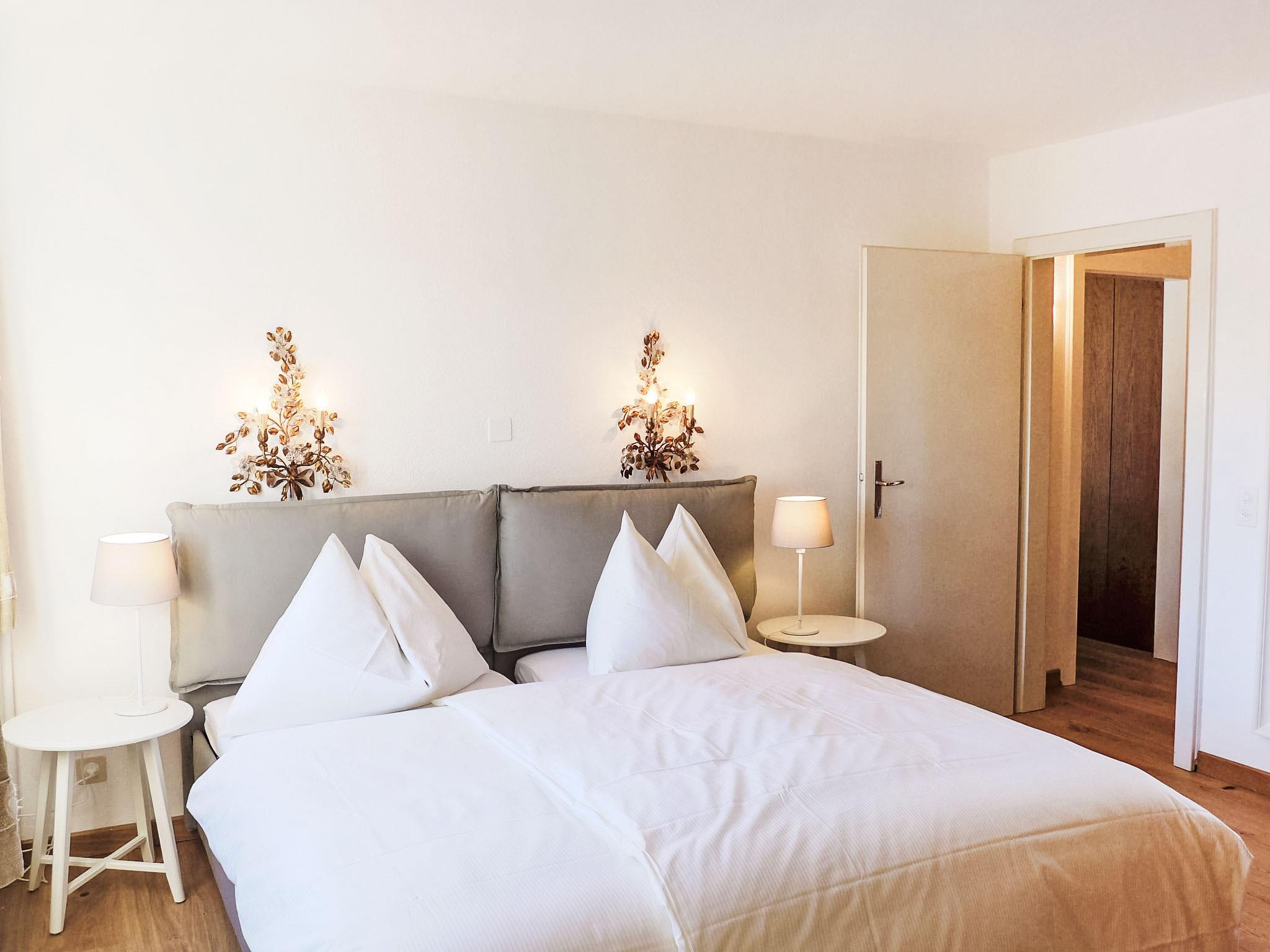"Chesa Cripels I", 3-room apartment 75 m2 on 2nd floor, east facing position. Spacious and bright, partly renovated in 2016, modern and cosy furnishings: living/dining room with satellite TV (flat screen), DVD. 1 large room with 2 beds (90 cm, length 200 cm), shower/bidet/WC. 1 small room with 2 beds (90 cm, length 200 cm). Small kitchen (4 hot plates, oven, dishwasher, toaster, kettle, electric coffee machine, Capsules for coffee machine (Nespresso) extra). Shower/WC. Parquet floors. Marvellous panoramic view of the lake and the mountains. Facilities: hair dryer. Internet (WiFi, free). Garage space n 4 on the property, height 205 cm, width 240 cm. Please note: suitable for families. Non-smokers only. Maximum 1 pet/ dog allowed. No lift.
