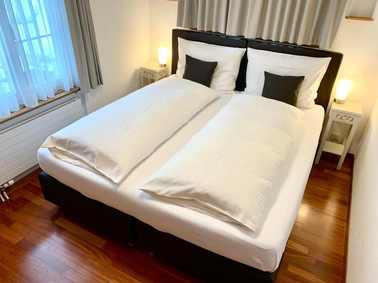 The interior of the flat is characterised by high-quality and tasteful furnishings. The modern kitchen is equipped with a ceramic hob, oven, dishwasher and a Nespresso coffee machine, as well as special crockery for raclette and fondue. In the living/dining room, a cosy sofa, Swisscom TV with over 200 channels, a large dining table and free Internet access make for comfortable hours. The two bedrooms with box-spring beds guarantee a restful night's sleep, while the bathroom with shower, toilet and integrated hairdryer leaves nothing to be desired.